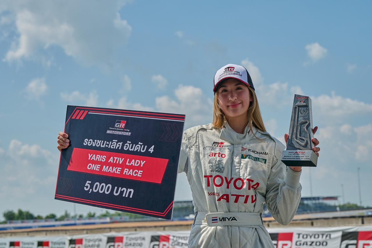 ด้าน มิย่า ทองเจือ ลูกสาวพ่อพีท ที่ลงแข่งในรุ่น ยาริส เอทีฟ เลดี้ วันเมคเรซ ฤดูกาลแรกก็แสดงฝีมือลูกไม้ใต้ต้นไล่เก็บอันดับจากกริดสตาร์ตลำดับ 8 อาศัยการตัดสินใจที่ฉับไวสลับตำแหน่งแซงขึ้นไปจบการแข่งขันขึ้นโพเดียมรับรางวัลรองชนะเลิศอันดับ 4 เป็นถ้วยแรกของการแข่งขันโตโยต้าวันเมคเรซได้สำเร็จ