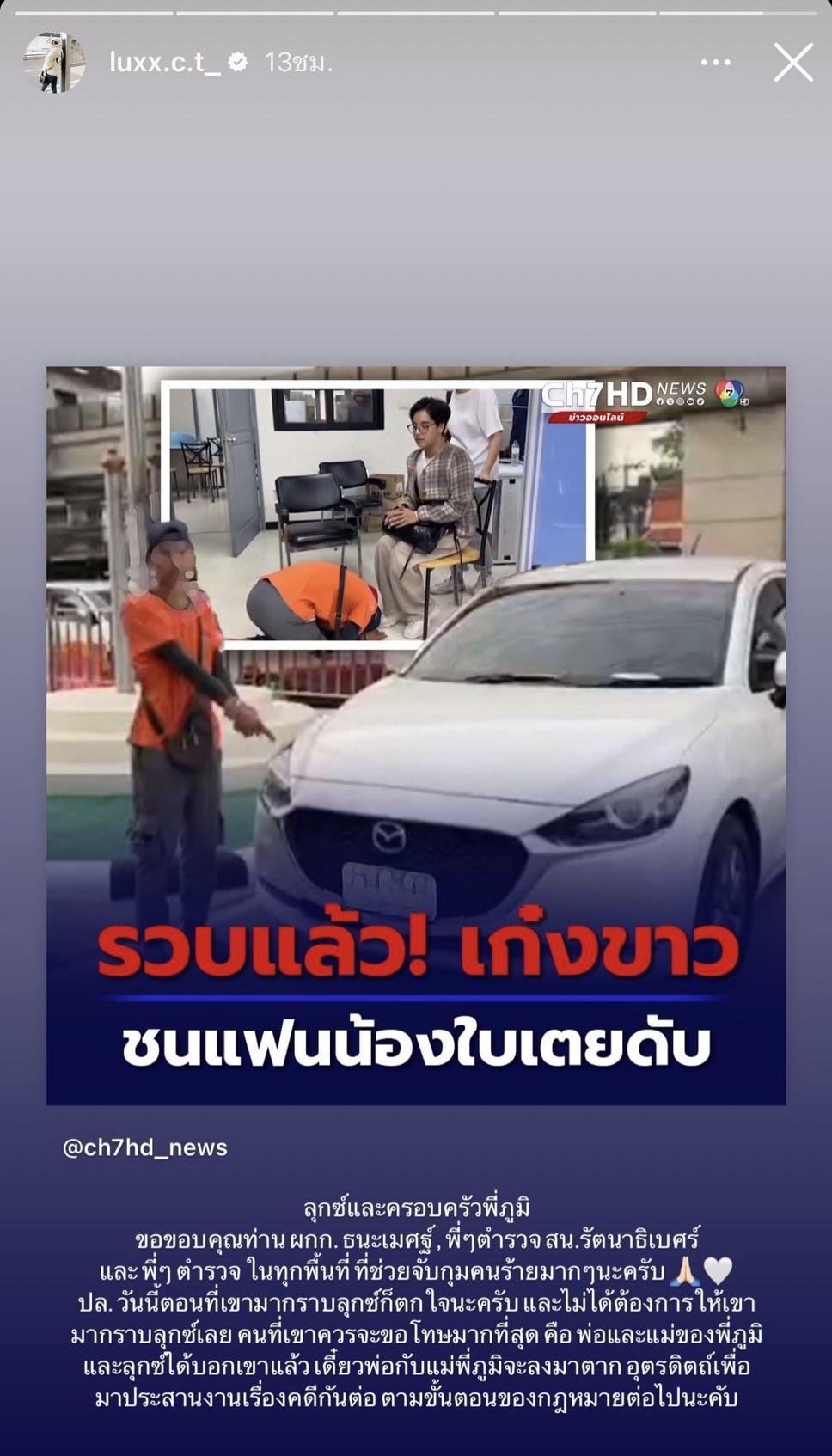 ต่อมาเจ้าหน้าที่ตำรวจได้ตามตัวได้แล้ว สำหรับหนุ่มขับเก๋งชนแฟนของ ลุกซ์ โดยผู้ต้องหาเผย ตนเกิดหลับในแล้วชนเข้ากับอะไรบางอย่าง คิดว่าชนฟุตปาทหรือเสาข้างทาง จึงได้ขับกลับที่พักย่านคลอง 3 จ.ปทุมธานี