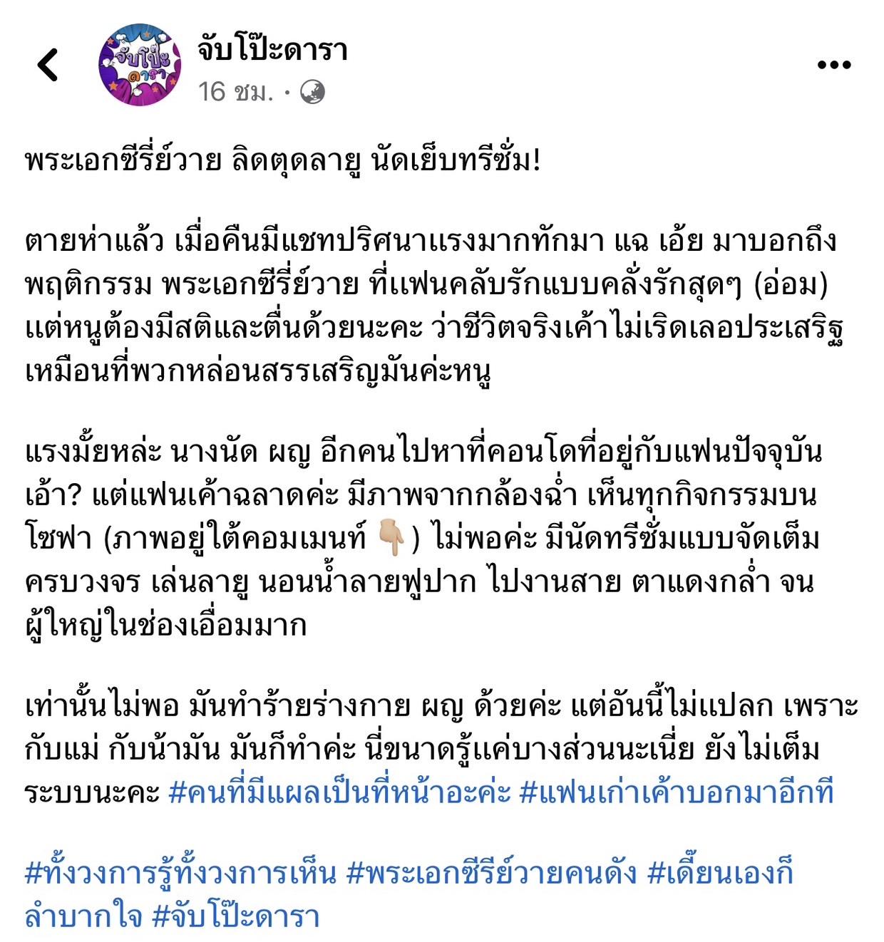 จากกรณีที่เเฟนเพจเฟซบุ๊กรายหนึ่ง ได้ออกมาหย่อนข้อความปริศนา ระบุว่า "พระเอกซีรีส์วาย ลิดตุดลายู นัดเย็บทรีซัม! ตายห่าแล้ว เมื่อคืนมีแชตปริศนาเเรงมากทักมา แฉ เอ้ย มาบอกถึง พฤติกรรม พระเอกซีรีส์วาย ที่เเฟนคลับรักแบบคลั่งรักสุดๆ (อ่อม) เเต่หนูต้องมีสติและตื่นด้วยนะคะ ว่าชีวิตจริงเค้าไม่เริดเลอประเสริฐ เหมือนที่พวกหล่อนสรรเสริญมันค่ะหนู แรงมั้ยล่ะ นางนัด ผญ. อีกคนไปหาที่คอนโดฯ ที่อยู่กับแฟนปัจจุบัน