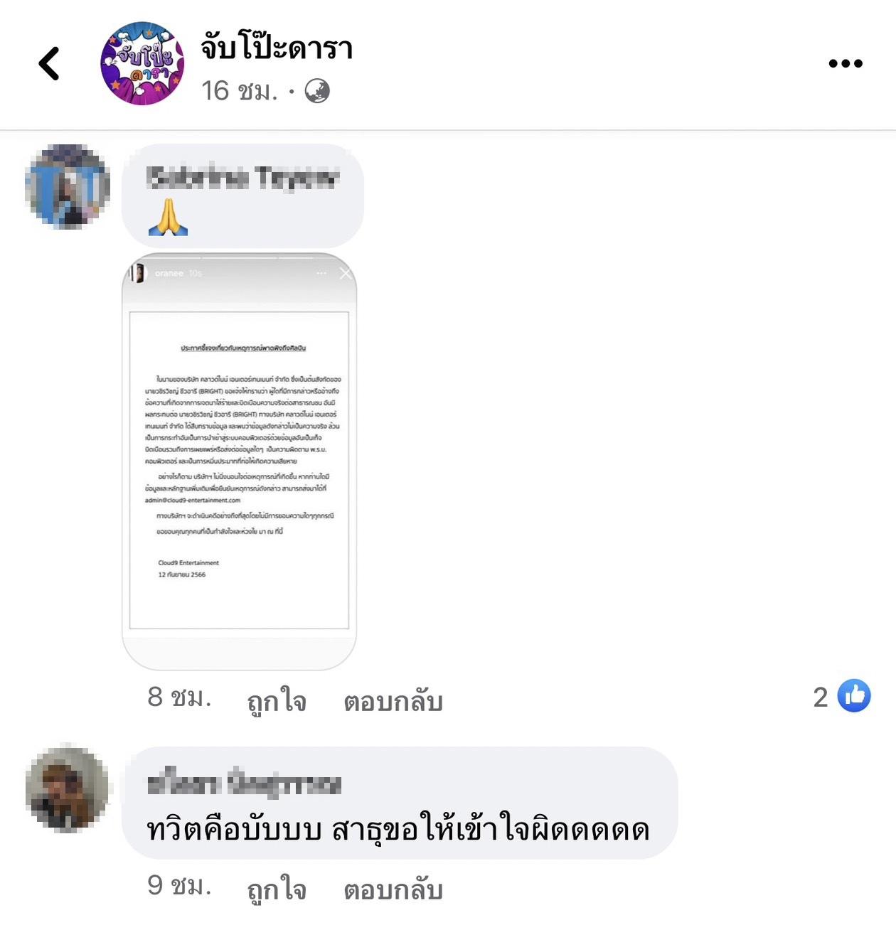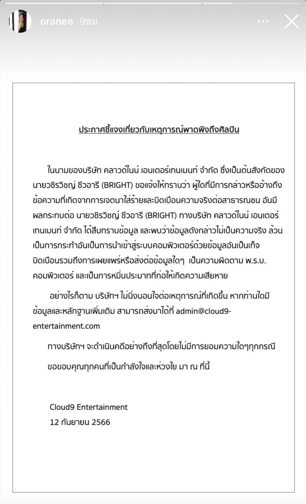 "ในนามของบริษัท คลาวด์ไนน์ เอนเตอร์เทนเมนท์ จำกัด ซึ่งเป็นต้นสังกัดของ นายวชิรวิชญ์ ชีวอารี (BRIGHT) ขอแจ้งให้ทราบว่า ผู้ใดที่มีการกล่าวหรืออ้างถึงข้อความที่เกิดจากการเจตนาใส่ร้ายและบิดเบือนความจริงต่อสาธารณชน
