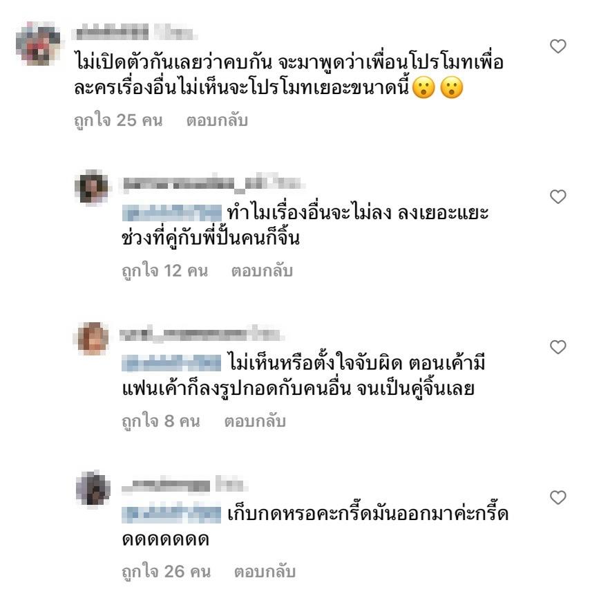 ขณะเดียวกันก็มีคนเข้ามาคอมเมนต์แซะว่า "ไม่เปิดตัวกันเลยว่าคบกัน จะมาพูดว่าเพื่อนโปรโมทเพื่อละครเรื่องอื่นไม่เห็นจะโปรโมทเยอะขนาดนี้" ซึ่งแฟนๆ ของสาวปราง ก็ไม่ปล่อยผ่าน แห่ปกป้องเธอจำนวนมาก