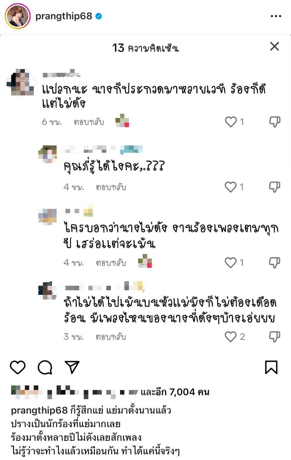 ซึ่ง สาวปรางทิพย์ ได้นำข้อความเหล่านี้มาโพสต์ลงอินสตาแกรมส่วนตัว พร้อมเผยความในใจบอกว่า "ก็รู้สึกแย่ แย่มาตั้งนานแล้ว ปรางเป็นนักร้องที่แย่มากเลย ร้องมาตั้งหลายปีไม่ดังเลยสักเพลง ไม่รู้ว่าจะทำไงแล้วเหมือนกัน ทำได้แค่นี้จริงๆ" ท่ามกลางแฟนคลับต่างมาคอมเมนต์ส่งกำลังใจให้เธอจำนวนมาก.
