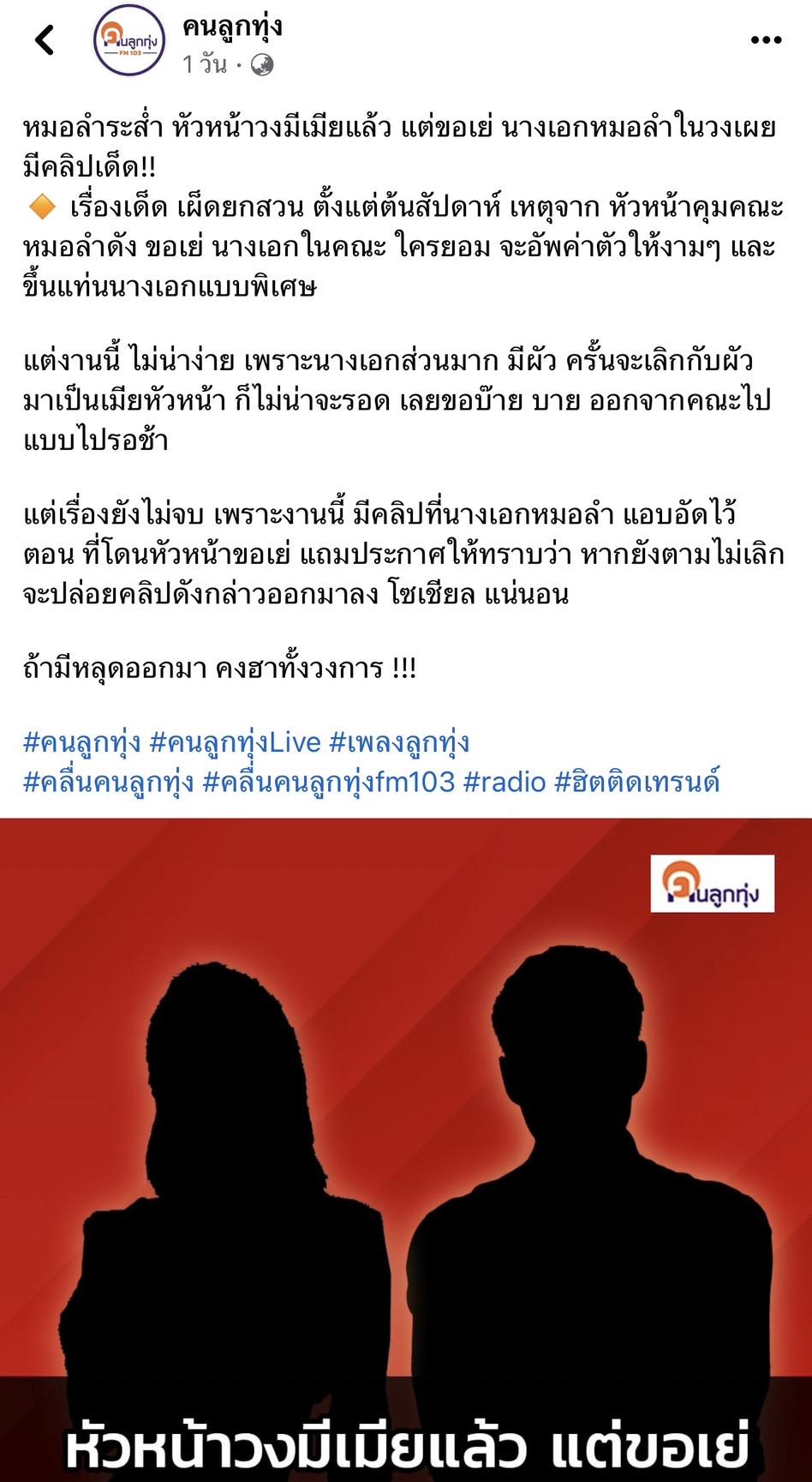 ทำชาวเน็ตหูผึ่งกันอีกแล้ว เมื่อเพจดังคนลูกทุ่ง โพสต์เม้าท์หมอลำระส่ำ หัวหน้าวงมีเมียแล้ว แต่ขอมีอะไรกับนางเอกหมอลำในวง แถมยังมีคลิปเด็ด ซึ่งถ้าใครยอมจะอัปค่าตัวให้งามๆ