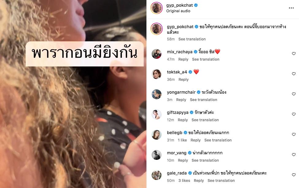 และต้องขอส่งกำลังใจให้กับอีกหนึ่งคนบันเทิง เมื่อดาราสาวชื่อดังอย่าง จิ๊บ ปกฉัตร ผู้ที่อยู่ในห้างดังย่านปทุมวัน หลังเกิดเหตุยิงกัน โดยเธอนั้นได้โพสต์คลิปวิดีโอขณะอยู่ภายในลิฟต์ ระบุข้อความว่า "ขอให้ทุกคนปลอดภัยนะคะ ตอนนี้จิ๊บออกมาจากห้างแล้วค่ะ" เเละโพสต์อีกครั้งว่า "ขอให้ทุกคนปลอดภัยค่ะ".