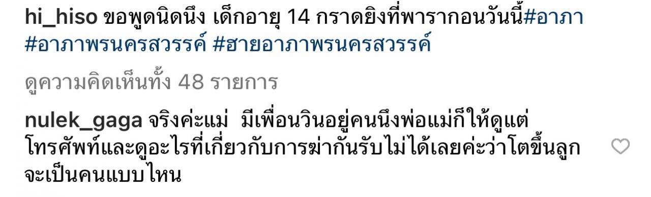พร้อมระบุแคปชั่นบอกว่า "ขอพูดนิดนึง เด็กอายุ 14 ยิงที่พารากอนวันนี้ #อาภา #อาภาพรนครสวรรค์ #ฮายอาภาพรนครสวรรค์"