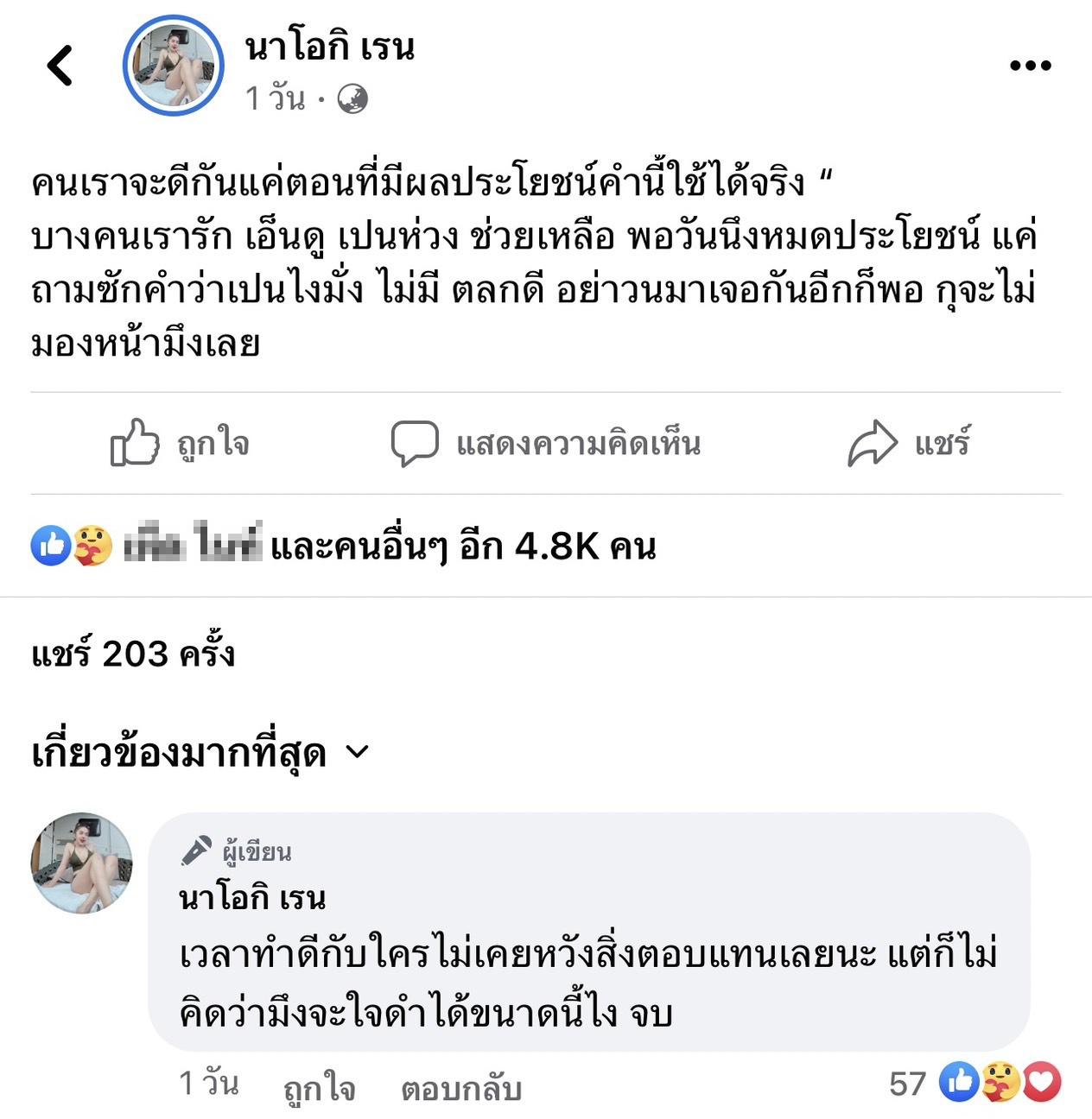 และยังคอมเมนต์เพิ่มเติมใต้โพสต์ดังกล่าว โดยระบุว่า "เวลาทำดีกับใครไม่เคยหวังสิ่งตอบแทนเลยนะ แต่ก็ไม่คิดว่ามึงจะใจดำได้ขนาดนี้ไง จบ" ท่ามกลางชาวเน็ตที่เข้ามาคอมเมนต์กันเป็นจำนวนมาก.
