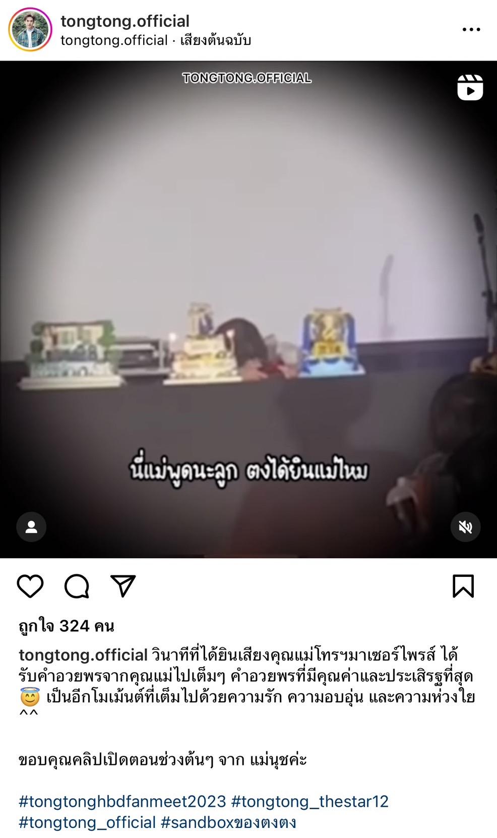 เสียดายเนอะแม่ไม่ได้ไปด้วย ขอให้ตงสนุกกับงานให้เต็มที่นะลูกนะ แม่ก็ไม่มีอะไรแล้ว ขอให้มีความสุข มีสุขภาพแข็งแรงแล้วกันลูก ขอให้สนุกเต็มที่นะลูกนะ ขอบคุณแฟนคลับทุกคน แม่ฝากดูแลแทนแม่ด้วยนะ แม่รักและเป็นห่วงตงตลอดนะลูกนะ แม่ไม่กวนแล้ว ขอบคุณนะคะ ขอบคุณแฟนคลับนะคะ แค่นี้นะลูกนะ"