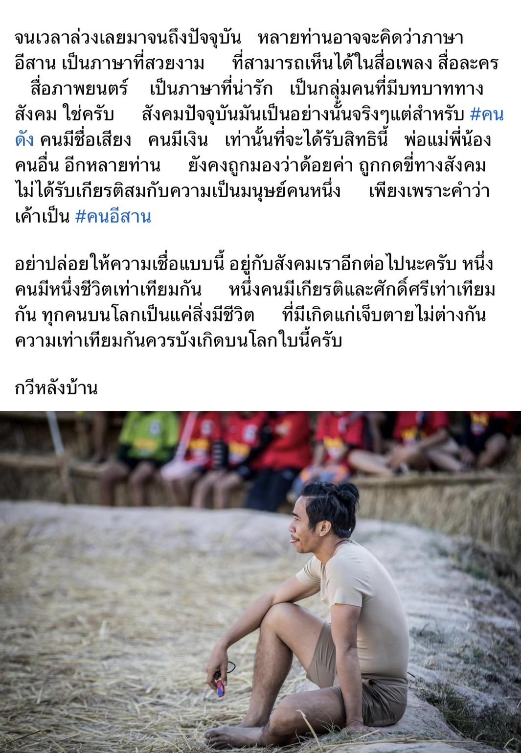จนเวลาล่วงเลยมาจนถึงปัจจุบัน หลายท่านอาจจะคิดว่าภาษาอีสาน เป็นภาษาที่สวยงาม ที่สามารถเห็นได้ในสื่อเพลง สื่อละคร สื่อภาพยนตร์ เป็นภาษาที่น่ารัก เป็นกลุ่มคนที่มีบทบาททางสังคม ใช่ครับ สังคมปัจจุบันมันเป็นอย่างนั้นจริงๆ แต่สำหรับ #คนดัง คนมีชื่อเสียง คนมีเงิน เท่านั้นที่จะได้รับสิทธินี้ พ่อแม่พี่น้องคนอื่นอีกหลายท่าน ยังคงถูกมองว่าด้อยค่า ถูกกดขี่ทางสังคม ไม่ได้รับเกียรติสมกับความเป็นมนุษย์คนหนึ่ง เพียงเพราะคำว่าเค้าเป็น #คนอีสาน