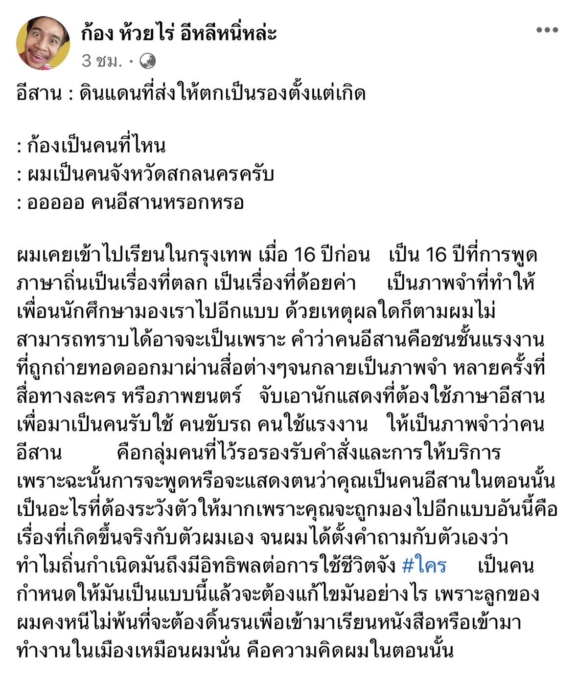เพราะฉะนั้นการจะพูดหรือจะแสดงตนว่าคุณเป็นคนอีสานในตอนนั้น เป็นอะไรที่ต้องระวังตัวให้มาก เพราะคุณจะถูกมองไปอีกแบบ อันนี้คือเรื่องที่เกิดขึ้นจริงกับตัวผมเอง จนผมได้ตั้งคำถามกับตัวเองว่า ทำไมถิ่นกำเนิดมันถึงมีอิทธิพลต่อการใช้ชีวิตจัง #ใคร เป็นคนกำหนดให้มันเป็นแบบนี้ แล้วจะต้องแก้ไขมันอย่างไร เพราะลูกของผมคงหนีไม่พ้นที่จะต้องดิ้นรนเพื่อเข้ามาเรียนหนังสือหรือเข้ามาทำงานในเมืองเหมือนผม นั่นคือความคิดผมในตอนนั้น