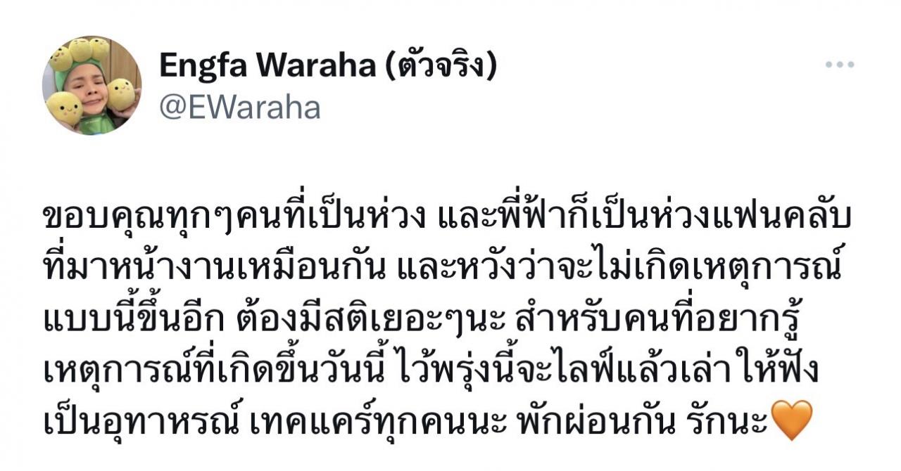 โดยเมื่อคืนนี้ (10 ตุลาคม 2566) สาวอิงฟ้า โพสต์ข้อความผ่านทวิตเตอร์ (X) บอกว่า "ขอบคุณทุกๆ คนที่เป็นห่วง และพี่ฟ้าก็เป็นห่วงแฟนคลับที่มาหน้างานเหมือนกัน และหวังว่าจะไม่เกิดเหตุการณ์แบบนี้ขึ้นอีก ต้องมีสติเยอะๆ นะ