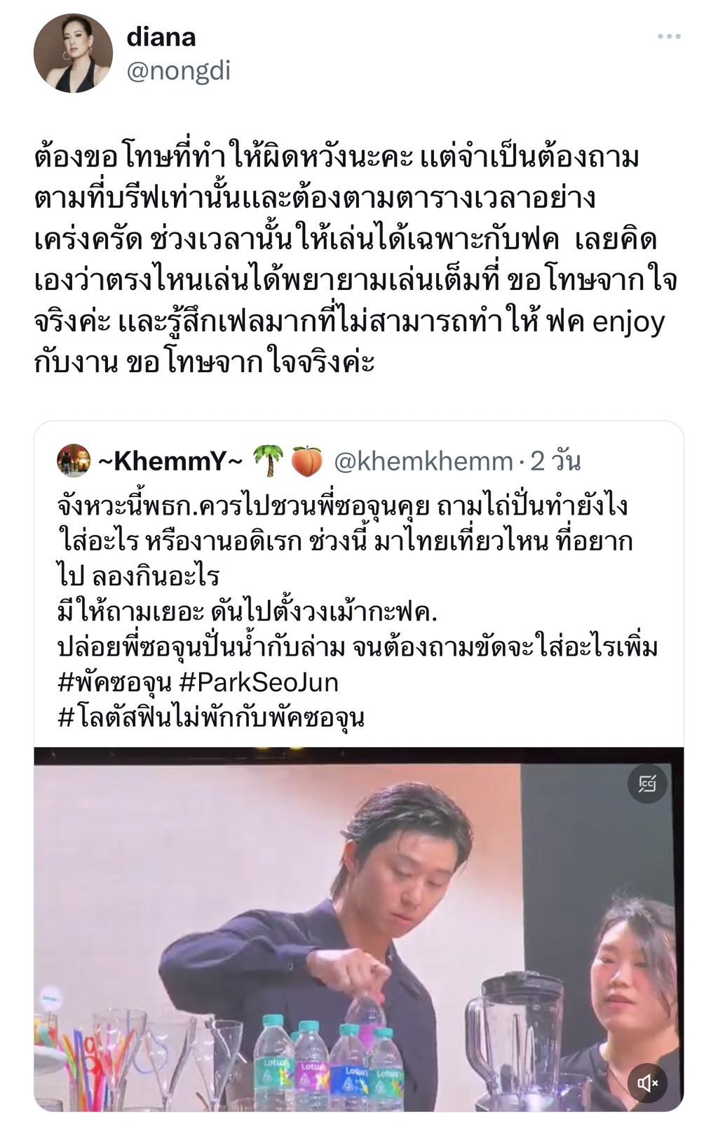 อีกหนึ่งประเด็นที่ถูกพูดถึงอย่างกว้างขวางในโลกออนไลน์ กับเรื่องราวที่พิธีกรชื่อดัง ได๋ ไดอาน่า ได้รับหน้าที่เป็นพิธีกรในงานแฟนมีตติ้งครั้งแรก The Golden Moment ฟินไม่พักกับพัคซอจุน ในวันที่ 21 ตุลาคม 2566 ณ QSNCC ศูนย์ประชุมแห่งชาติสิริกิติ์