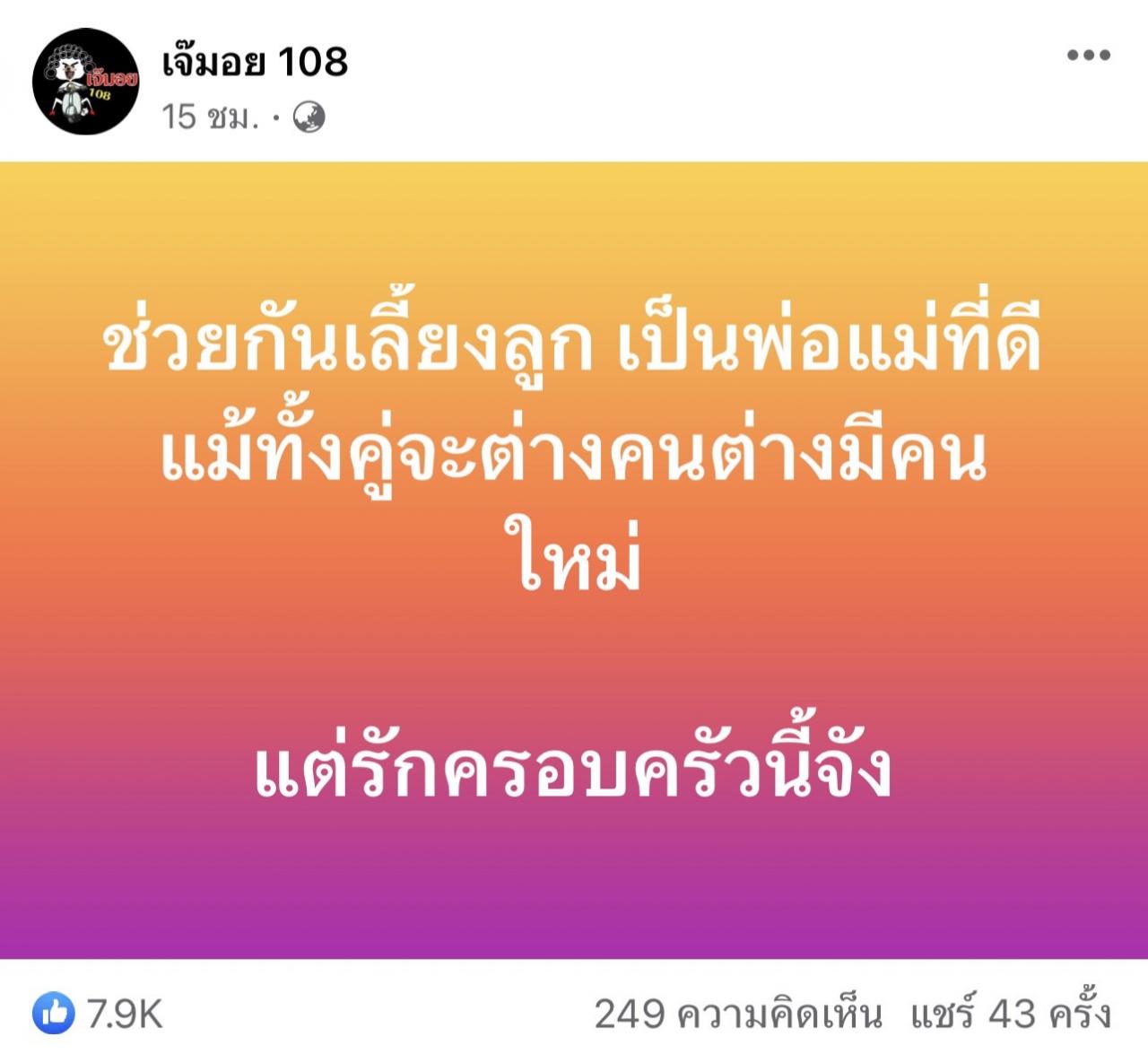 โดย เจ๊มอย ได้ระบุข้อความว่า "ช่วยกันเลี้ยงลูก เป็นพ่อแม่ที่ดี แม้ทั้งคู่จะต่างคนต่างมีคนใหม่ แต่รักครอบครัวนี้จัง" ซึ่งหลังโพสต์ถูกแชร์ออกไป ก็มีบรรดาลูกเพจเข้ามาแสดงความคิดเห็นกันมากมาย