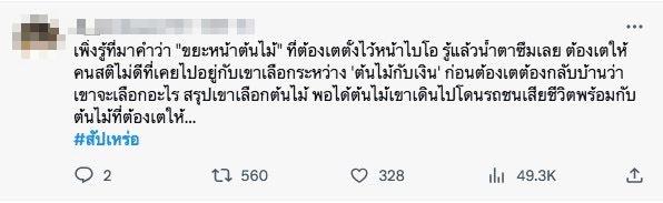 จากเรื่องราวดังกล่าวถูกชาวเน็ตพูดถึงกันเป็นวงกว้าง และมีผู้ใช้ทวิตเตอร์ (X) รายหนึ่งได้ระบุข้อความว่า "เพิ่งรู้ที่มาคำว่า "ขยะหน้าต้นไม้" ที่ต้องเตตั้งไว้หน้าไบโอ รู้แล้วนำตาซึมเลย ต้องเตให้คนสติไม่ดีที่เคยไปอยู่กับเขาเลือกระหว่าง 'ต้นไม้กับเงิน' ก่อนต้องเตต้องกลับบ้านว่าเขาจะเลือกอะไร สรุปเขาเลือกต้นไม้ พอได้ต้นไม้ เขาเดินไปโดนรถชนเสียชีวิตพร้อมกับ ต้นไม้ที่ต้องเตให้... #สัปเหร่อ"