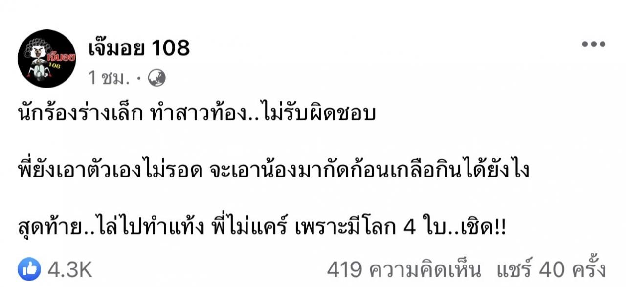 โดยเพจดังได้ระบุข้อความว่า "นักร้องร่างเล็ก ทำสาวท้อง..ไม่รับผิดชอบพี่ยังเอาตัวเองไม่รอด จะเอาน้องมากัดก้อนเกลือกินได้ยังไง สุดท้าย..ไล่ไปทำแท้งพี่ไม่แคร์ เพราะมีโลก 4 ใบ..เชิด!!..."