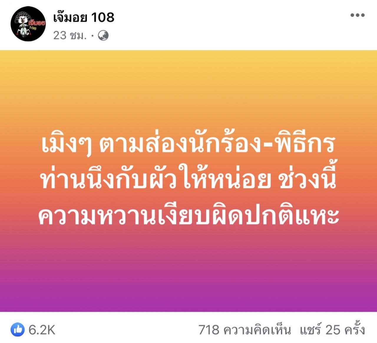 โดยเพจดังอย่าง เจ๊มอย 108 ได้ออกมาระบุข้อความดังกล่าวว่า "เมิงๆ ตามส่องนักร้อง-พิธีกรท่านนึงกับผัวให้หน่อย ช่วงนี้ความหวานเงียบผิดปกติแหะ" ท่ามกลางชาวเน็ตที่เข้ามาทายกันสนั่นว่าเป็นคู่ไหน