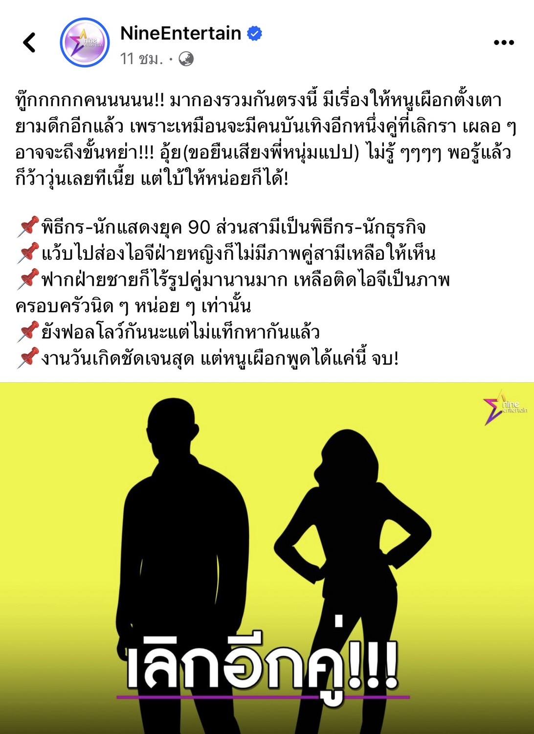 ล่าสุดทางเพจดัง อย่าง NineEntertain ได้มีคำใบ้มาฝากลูกเพจเพื่อให้ทำการบ้านกันง่ายๆ โดยระบุข้อความว่า "พิธีกร-นักแสดงยุค 90 ส่วนสามีเป็นพิธีกร-นักธุรกิจ, แวบไปส่องไอจีฝ่ายหญิงก็ไม่มีภาพคู่สามีเหลือให้เห็น, ฟากฝ่ายชายก็ไร้รูปคู่มานานมาก เหลือติดไอจีเป็นภาพครอบครัวนิดๆ หน่อยๆ เท่านั้น, ยังฟอลโลว์กันนะแต่ไม่แท็กหากันแล้ว, งานวันเกิดชัดเจนสุด แต่หนูเผือกพูดได้แค่นี้ จบ!"