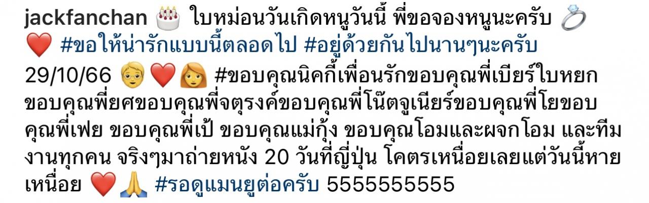 โดย หนุ่มแจ็ค โพสต์ภาพผ่านอินสตาแกรม พร้อมข้อความว่า “ใบหม่อนวันเกิดหนูวันนี้ พี่ขอจองหนูนะครับ (อีโมจิรูปแหวน) ขอให้น่ารักแบบนี้ตลอดไป อยู่ด้วยกันไปนาน ๆ นะครับ