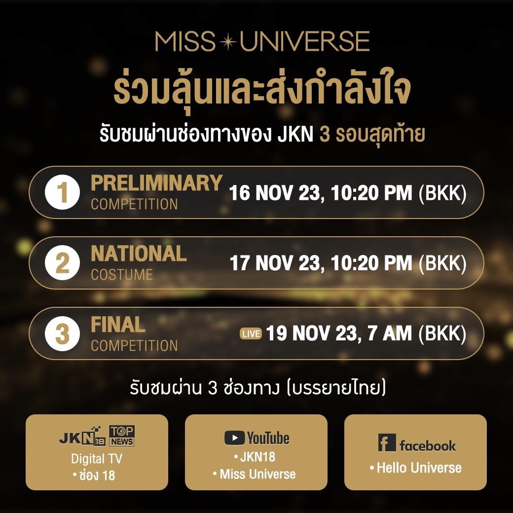 รอบตัดสิน (Final Competition) วันที่ 19 พฤศจิกายน ชมสด เวลา 07.00 น. ทางช่อง JKN18 และสามารถรับชมผ่านช่องทางออนไลน์ ดังนี้ YouTube : JKN18 / YouTube : Miss Universe / Facebook : Hello Universe