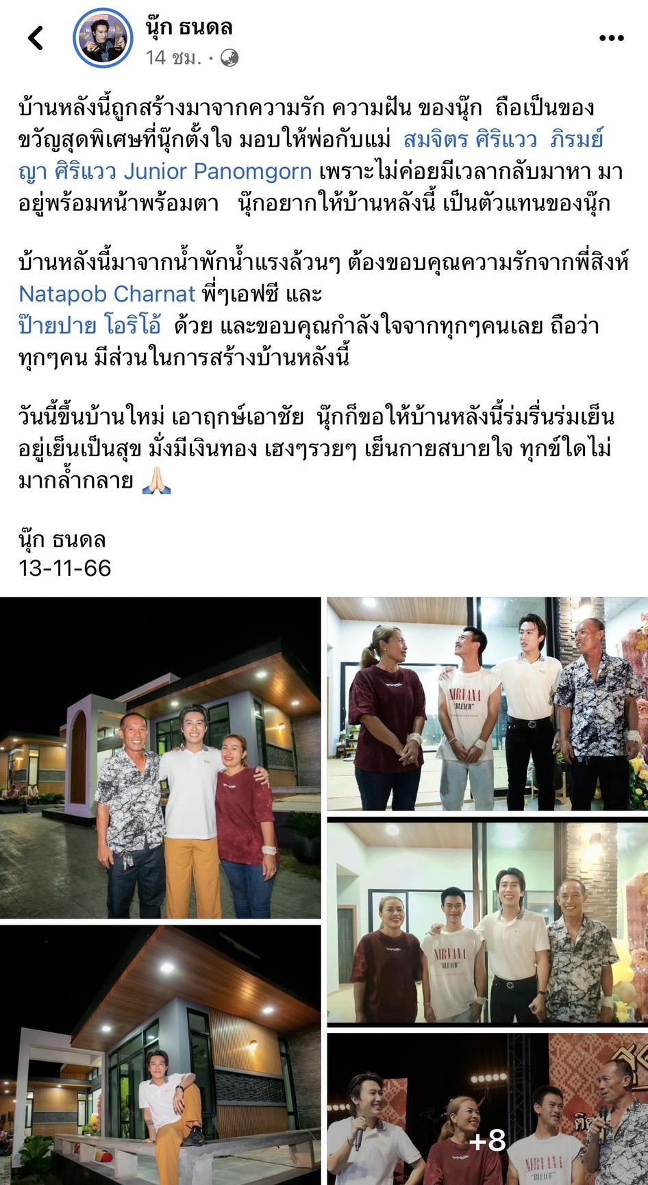 เป็นอีกโมเมนต์น่ายินดีสุดๆ สำหรับ นุ๊ก ธนดล ศิริแวว ที่ล่าสุดวันที่ 13 พ.ย. 2566 ที่ผ่านมา ได้ขึ้นบ้านใหม่กับครอบครัว และหลายๆ โพสต์ของนุ๊กก็มีแฟนคลับต่างเข้ามาร่วมแสดงความยินดีกันอย่างล้นหลาม อีกทั้งเจ้าตัวยังได้เขียนถึงความภูมิใจในวันที่ขึ้นบ้านใหม่ครั้งนี้ด้วย