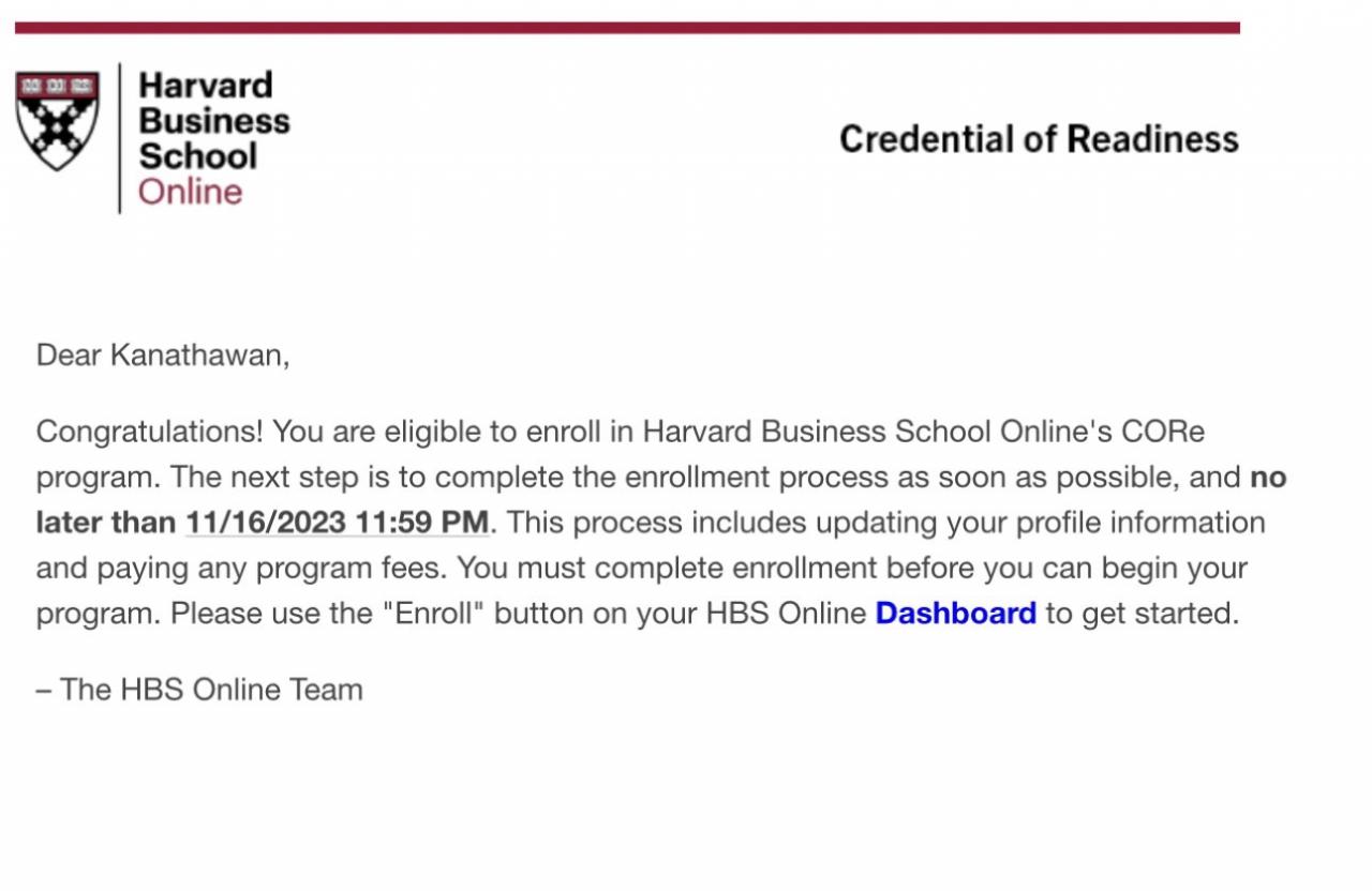 ซึ่งโปรแกรมแรกที่จูนเรียน ต้องใช้เวลาประมาณครึ่งปีถึงจะจบและได้ผลการเรียน เพราะมีการสอบ Final ด้วยค่ะ อาจารย์ที่สอนจูนก็ระดับโลกมากๆ ค่าเทอมเฉพาะค่าวิชาเรียนอย่างเดียวในโปรแกรมแรกนี้ก็ร่วมแสน จูนก็ดำเนินการลงทะเบียนและชำระค่าเทอมเรียบร้อยครบทุกกระบวนการแล้ว รอเปิดเทอมค่ะ และเมื่อเราสอบ Final เสร็จและเรียนจบ ทางมหาวิทยาลัย Harvard จะออกหนังสือรับรองผลการเรียนและการจบให้เราค่ะ เรียกว่าใบ credential of readiness (โปรแกรมที่จูนเรียนนี้จะไม่ใช่ใบเซอร์)