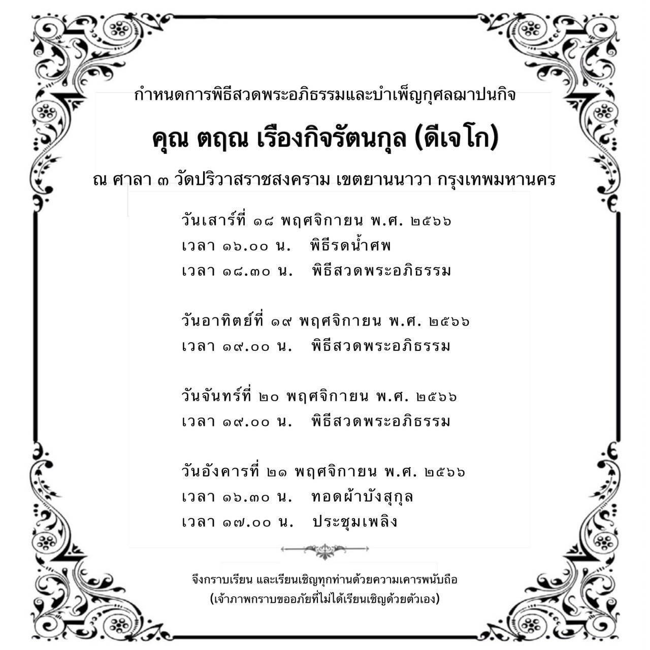 สำหรับกำหนดการสวดพระอภิธรรม และฌาปนกิจศพ ดีเจโก ตฤณ นั้นจัดขึ้นที่ วัดปริวาสราชสงคราม ศาลา 3 มีกำหนดรดน้ำในเวลา 16.00 น. สวดพระอภิธรรมเวลา 18.30 น. และจากนั้นทางครอบครัวได้มีสวดพระอภิธรรมตั้งแต่วันที่ 19-20 พ.ย. เวลา 19.00 น. และมีพิธีฌาปนกิจศพ ในวันที่ 21 พ.ย. เวลา 17.00 น.