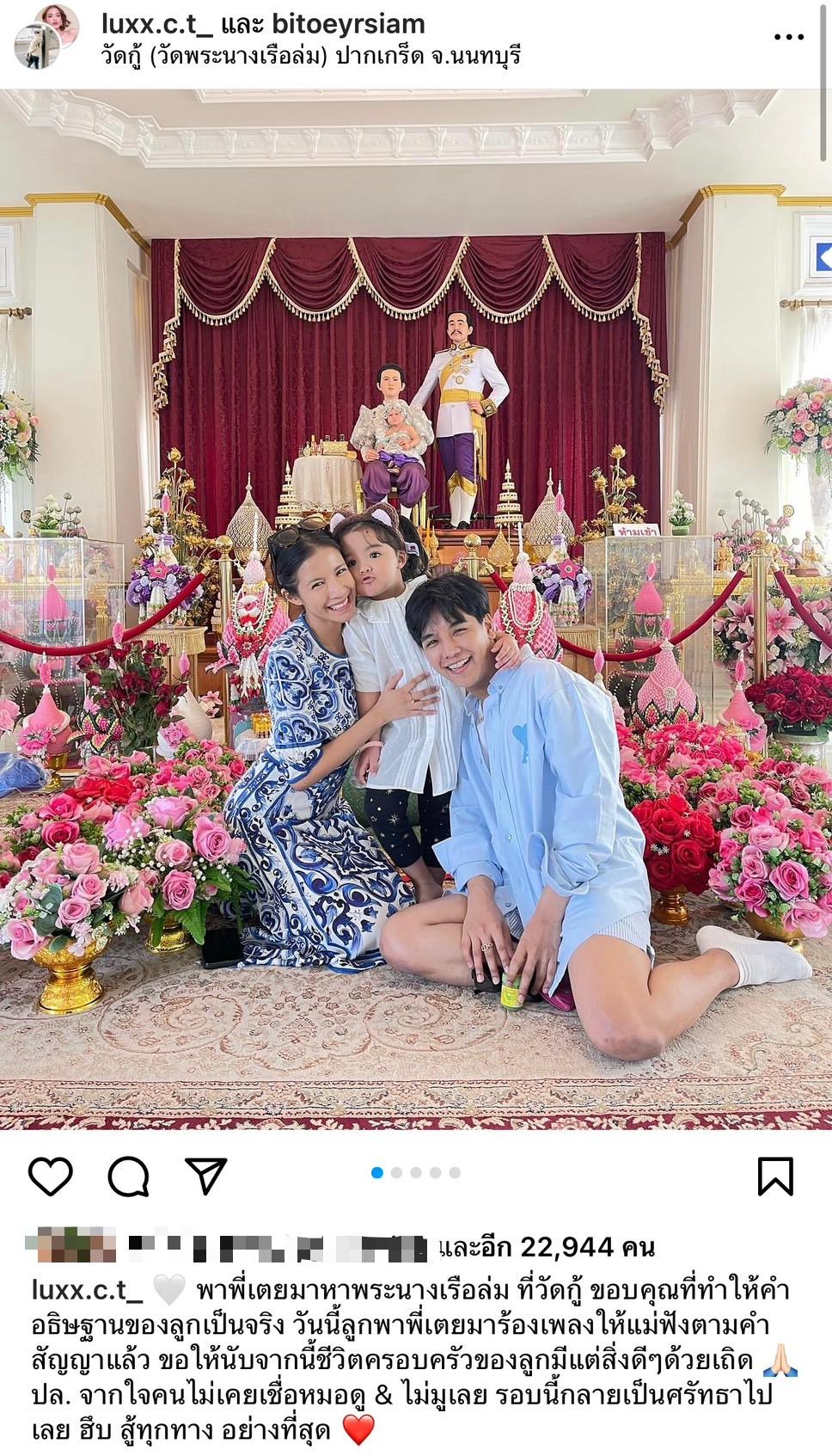 โดยล่าสุด ลุกซ์ น้องชายได้โพสต์ภาพพาพี่สาวอย่าง ใบเตย และน้องเวทมนต์ ไปทำบุญขอพรที่ วัดกู้ จ.นนทบุรี หลังจากคำอธิษฐานต่อพระนางเรือล่มเป็นจริง พร้อมระบุแคปชั่นว่า "พาพี่เตยมาหาพระนางเรือล่ม ที่วัดกู้ ขอบคุณที่ทำให้คำอธิษฐานของลูกเป็นจริง วันนี้ลูกพาพี่เตยมาร้องเพลงให้แม่ฟังตามคำสัญญาแล้ว