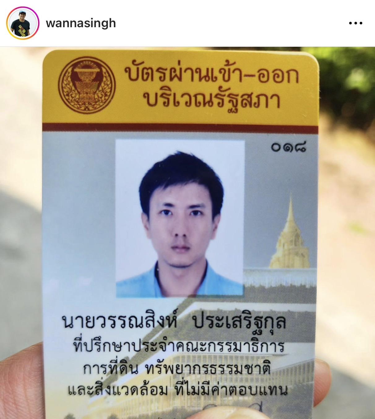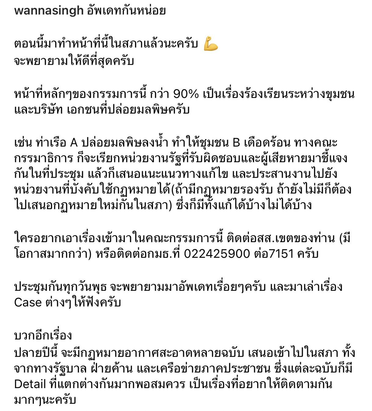โดยระบุข้อความว่า "ตอนนี้มาทำหน้าที่นี้ในสภาแล้วนะครับ จะพยายามให้ดีที่สุดครับ หน้าที่หลักๆ ของกรรมการนี้ กว่า 90% เป็นเรื่องร้องเรียนระหว่างชุมชน และบริษัทเอกชนที่ปล่อยมลพิษครับ