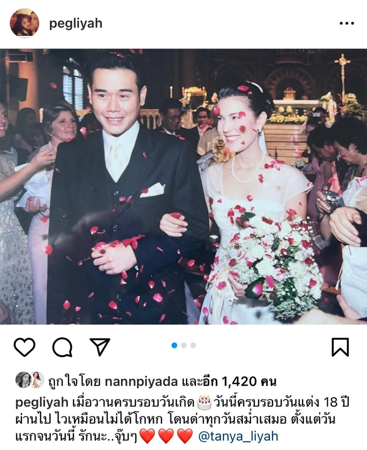 "เมื่อวานครบรอบวันเกิด วันนี้ครบรอบวันแต่ง 18 ปีผ่านไป ไวเหมือนไม่ได้โกหก โดนด่าทุกวันสม่ำเสมอ ตั้งแต่วันแรกจนวันนี้ รักนะ..จุ๊บๆ".