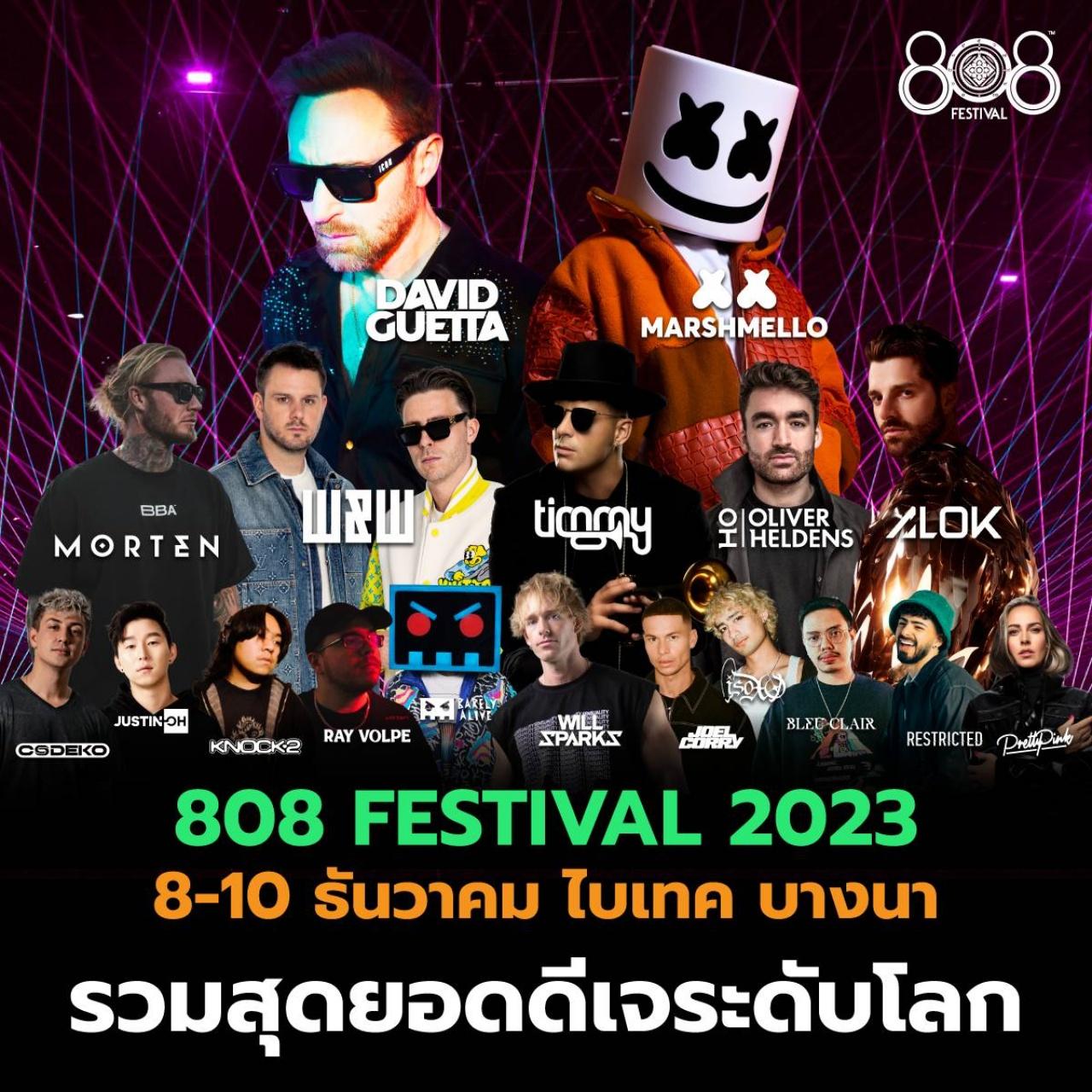 ในปี 2023 งาน 808 Festival ที่จะจัดขึ้นในระหว่างวันที่ 8-9-10 ธันวาคมนี้ ที่ ไบเทค บางนา ยังคงเดินหน้าสร้างความเป็นเบอร์หนึ่งของเทศกาลดนตรี EDM ทั้งในไทยและเอเชียด้วยการดึงดีเจที่แฟนๆ ทั่วโลกชื่นชอบมากที่สุดอย่าง David Guetta ไม่ใช่เรื่องง่ายเลยที่จะให้เทพเจ้าดีเจชาวฝรั่งเศสคนนี้มาเปิดเพลงให้แฟนๆ ได้เต้นกับแบบลืมหายใจในไทย พร้อมกับเทพเจ้าดีเจอีกหลายคนในวงการอย่าง Marshmello ที่คงไม่ต้องบรรยายสรรพคุณอะไรกันมากมายสำหรับสุดยอดดีเจคนนี้, Alok ดีเจแนวฟิวเจอร์เฮาส์และบราซิลเลียน เบส, Oliver Heldens ดีเจแนวบิ๊กรูมเฮาส์และเทคเฮาส์, W&W คู่หูดีเจที่ได้รับการยกย่องว่าเปิดเพลงแนวโปรเกรสซีฟแทรนซ์ได้เทพที่สุดในเวลานี้ Timmy Trumpet ที่เปิดเพลงแดนซ์ในแนวอิเล็กโทรฯ-เฮาส์, ไซแทรนซ์ ไปจนถึง ฮาร์ดสไตล์ ได้มันมากๆ ซึ่งการนำทรัมเป็ตมาเป่าระหว่างโชว์ก็สร้างเอกลักษณ์เฉพาะตัวให้กับเขาได้แบบไม่เหมือนใครจริงๆ โดยดีเจทุกคนเป็นศิลปินเฮดไลน์ที่รับประกันได้ว่าจะนำบีตสุดมัน, เมโลดี้ที่ไพเราะ และการมิกซ์เพลงไล่ระดับความมันในระดับเทพเจ้าให้พื้นเวทีพังราพณาสูรกันเป็นแถบๆ แน่นอน