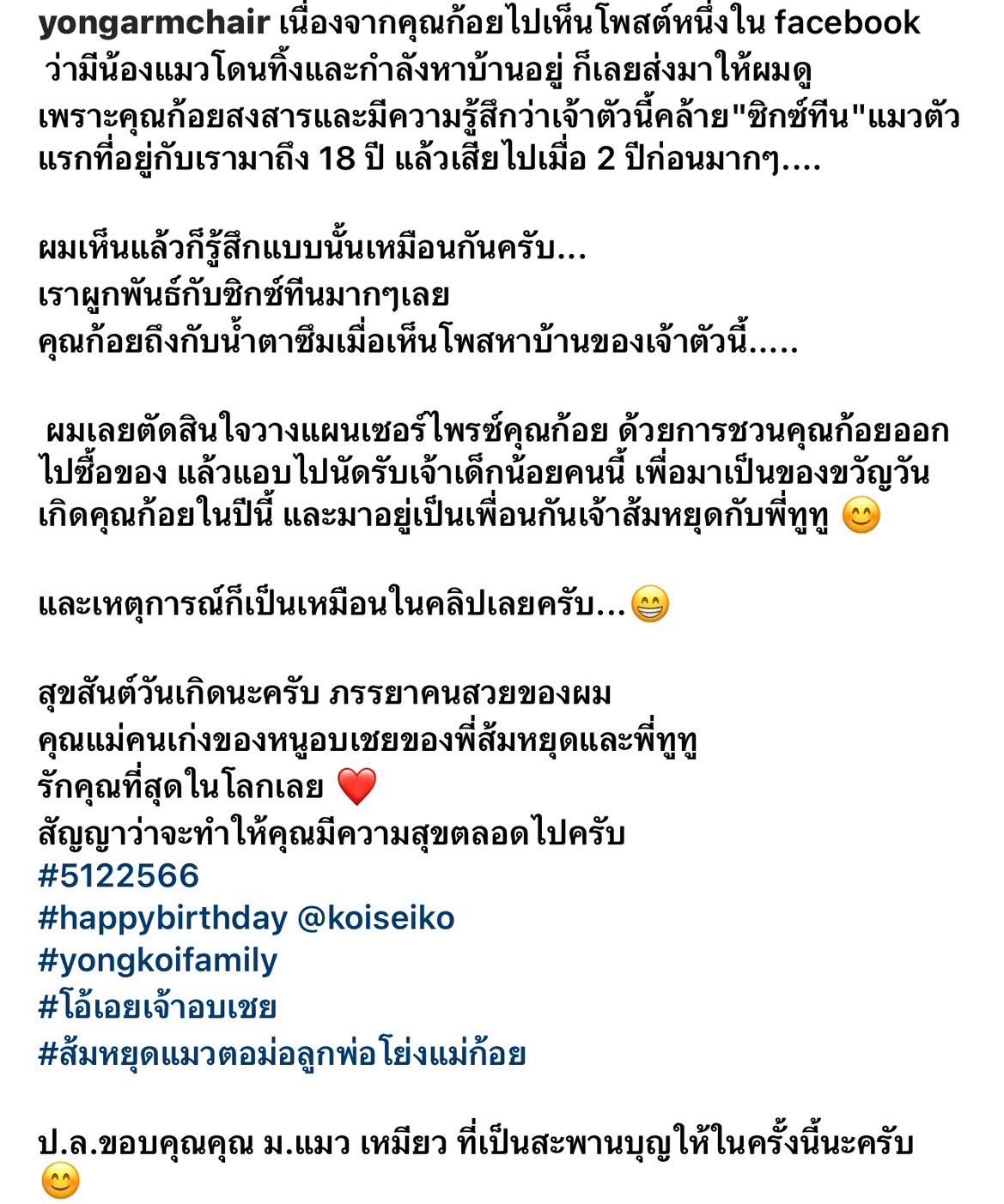 ซึ่ง หนุ่มโย่ง ได้ลงคลิป พร้อมเขียนเล่าอย่างละเอียดว่า "เนื่องจากคุณก้อยไปเห็นโพสต์หนึ่งใน facebook ว่ามีน้องแมวโดนทิ้งและกำลังหาบ้านอยู่ ก็เลยส่งมาให้ผมดู เพราะคุณก้อยสงสารและมีความรู้สึกว่าเจ้าตัวนี้คล้าย "ซิกซ์ทีน" แมวตัวแรกที่อยู่กับเรามาถึง 18 ปี แล้วเสียไปเมื่อ 2 ปีก่อนมากๆ....
