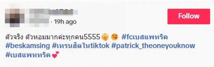 ล่าสุดแฟนคลับที่บังเอิญเจอ สาวเบสท์ ได้ถ่ายลงโซเชียล พร้อมคอนเฟิร์มด้วยแคปชั่นที่บอกว่า "ตัวจริง ตัวหอมมากค่ะทุกคน5555 #fcเบสแพทริค #beskamsing #เทรนฮิตในtiktok #patrick_theoneyouknow #เบสแพททริค"