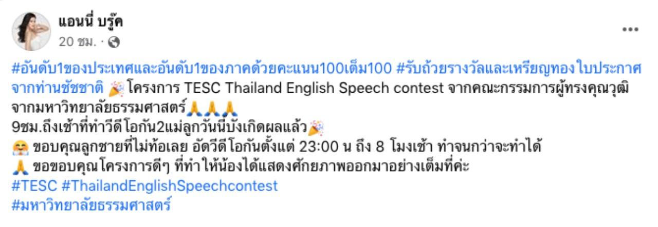 9 ชม. ถึงเช้าที่ทำวิดีโอกัน 2 แม่ลูก วันนี้บังเกิดผลแล้ว ขอบคุณลูกชายที่ไม่ท้อเลย อัดวิดีโอกันตั้งแต่ 23.00 น. ถึง 8 โมงเช้า ทำจนกว่าจะทำได้ ขอขอบคุณโครงการดีๆ ที่ทำให้น้องได้แสดงศักยภาพออกมาอย่างเต็มที่ค่ะ #TESC #ThailandEnglishSpeechcontest #มหาวิทยาลัยธรรมศาสตร์" หลายคนที่ติดตามต่างเข้ามาแสดงความยินดี พร้อมกับชื่นชม น้องฑีฆายุ กันจำนวนมาก.