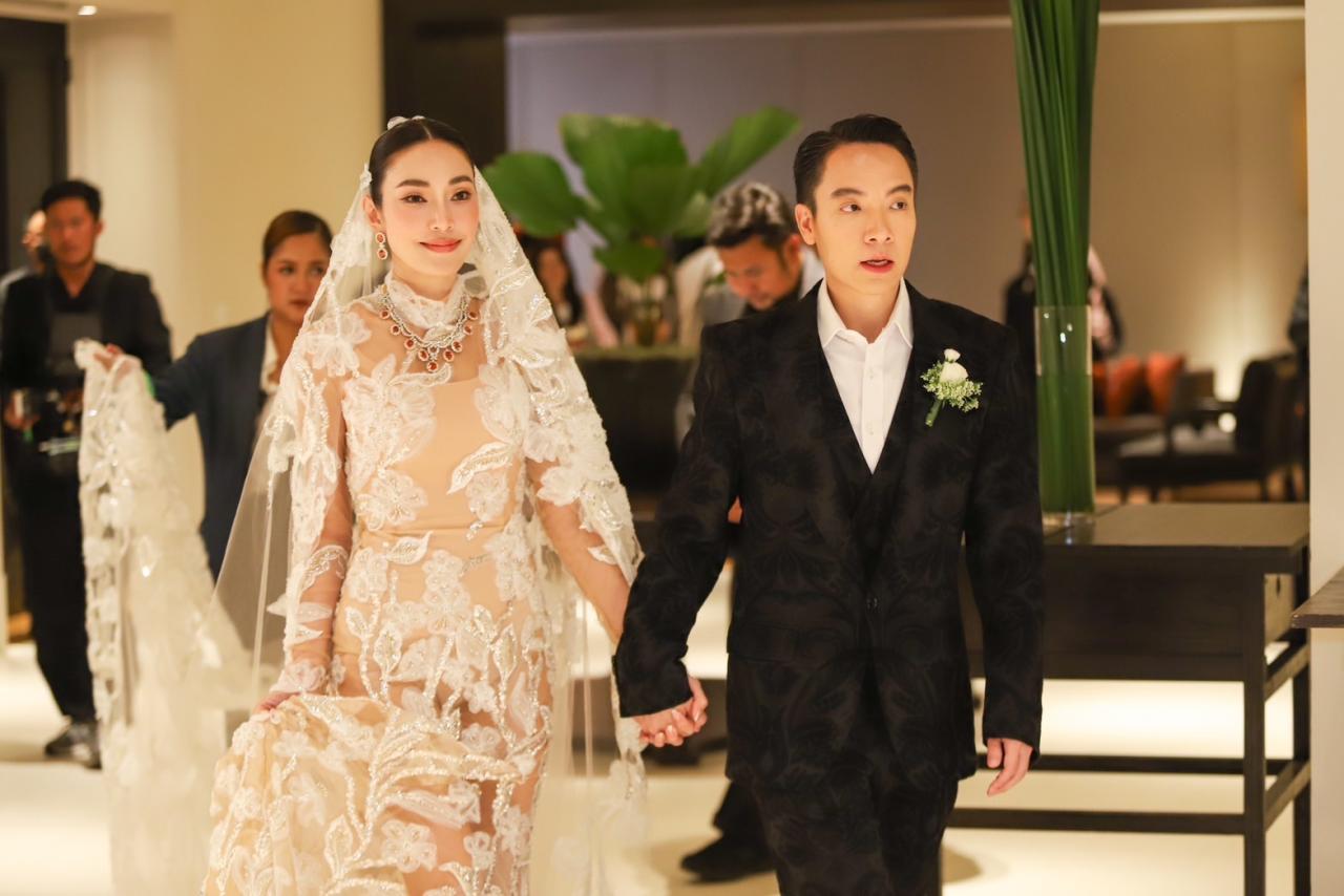เมย์ : “จีนเลยค่ะ สวมแหวนหมั้นเสร็จแล้วก็ไปเปลี่ยนชุดเป็นยกน้ำชา คือที่บ้านเราทั้งสองฝ่ายมีเชื้อจีนค่อนข้างเยอะ ญาติๆ ก็อยากจะให้ใส่ชุดสีแดง หน้าเราก็ได้อยู่ แล้วเราก็เคยได้ฉายาจากพี่ๆ สื่อว่าเป็นซูฉีเมืองไทย เราก็เลยจัดเต็มค่ะ มีเกี้ยว มีสิงโต สนุกมากค่ะ เมย์ก็เป็นคนช่วยคิดแพลนงาน แล้วก็ช่วยออกไอเดียหลักๆ บอกเวดดิ้งแพลนเนอร์ และบอกเรื่องธีมงานตอนเช้า ทุกคนทำออกมาโดนใจเรามาก เมย์ก็มีดีเทลเล็กๆ ของเมย์ บิ๊กก็ให้อิสระในการสนุกของเราเต็มที่”