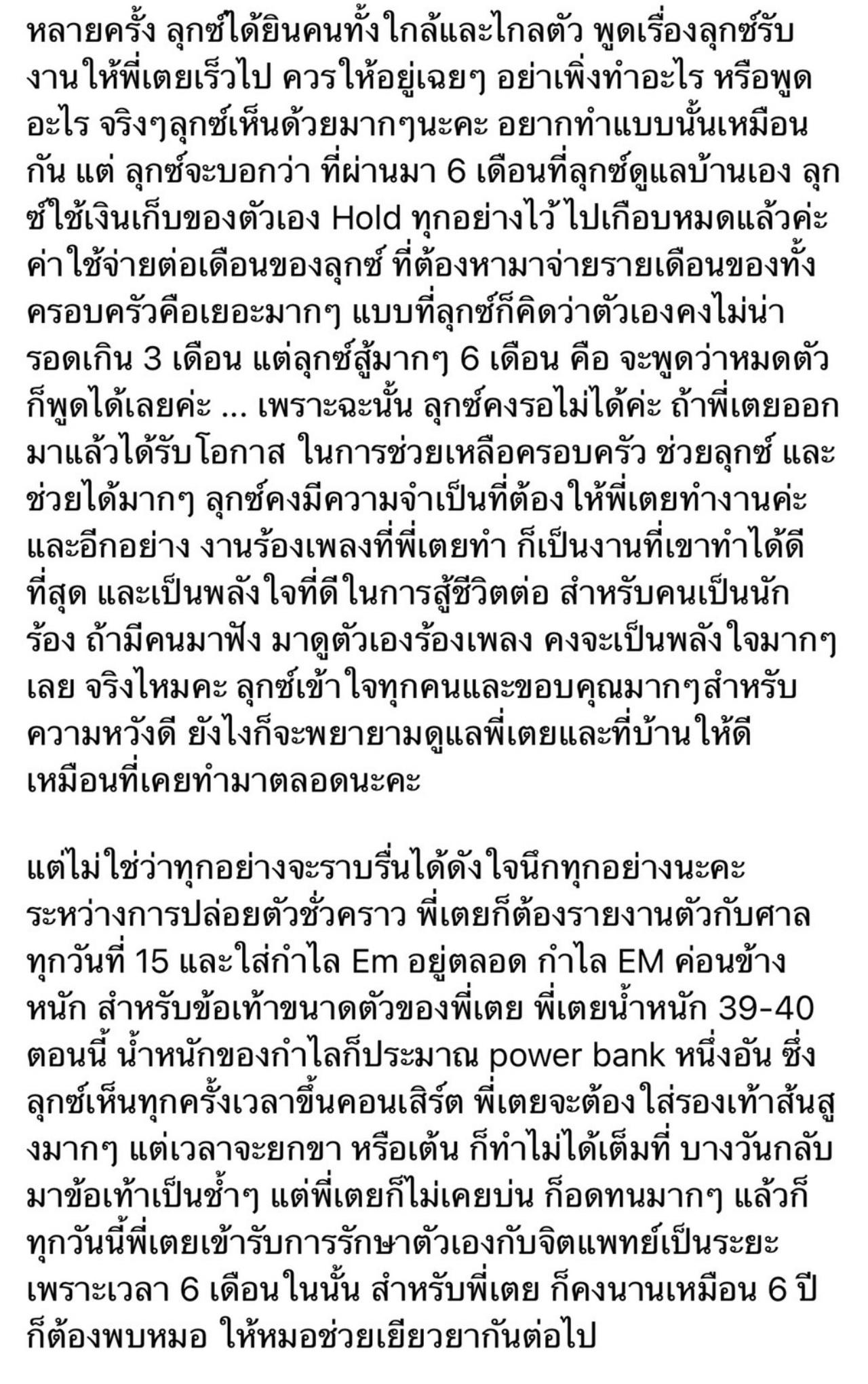 ค่าใช้จ่ายต่อเดือนของลุกซ์ ที่ต้องหามาจ่ายรายเดือนของทั้งครอบครัวคือเยอะมากๆ แบบที่ลุกซ์ก็คิดว่าตัวเองคงไม่น่ารอดเกิน 3 เดือน แต่ลุกซ์สู้มากๆ 6 เดือน คือ จะพูดว่าหมดตัว ก็พูดได้เลยค่ะ ... เพราะฉะนั้น ลุกซ์คงรอไม่ได้ค่ะ ถ้าพี่เตยออกมาแล้วได้รับโอกาส ในการช่วยเหลือครอบครัว ช่วยลุกซ์ และช่วยได้มากๆ ลุกซ์คงมีความจำเป็นที่ต้องให้พี่เตยทำงานค่ะ