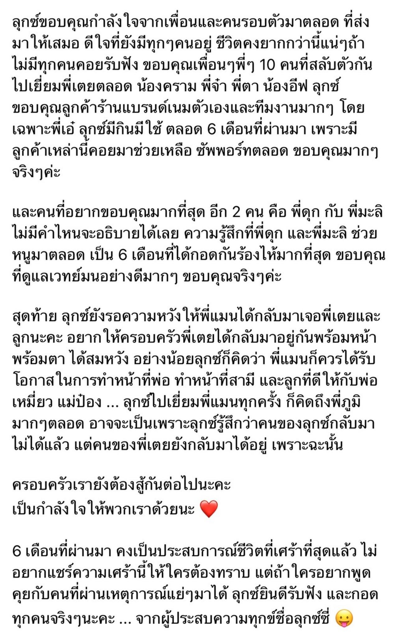 6 เดือนที่ผ่านมา คงเป็นประสบการณ์ชีวิตที่เศร้าที่สุดแล้ว ไม่อยากแชร์ความเศร้านี้ให้ใครต้องทราบ แต่ถ้าใครอยากพูดคุยกับคนที่ผ่านเหตุการณ์แย่ๆ มาได้ ลุกซ์ยินดีรับฟัง และกอดทุกคนจริงๆ นะคะ ... จากผู้ประสบความทุกข์ชื่อลุกซ์ซี่"