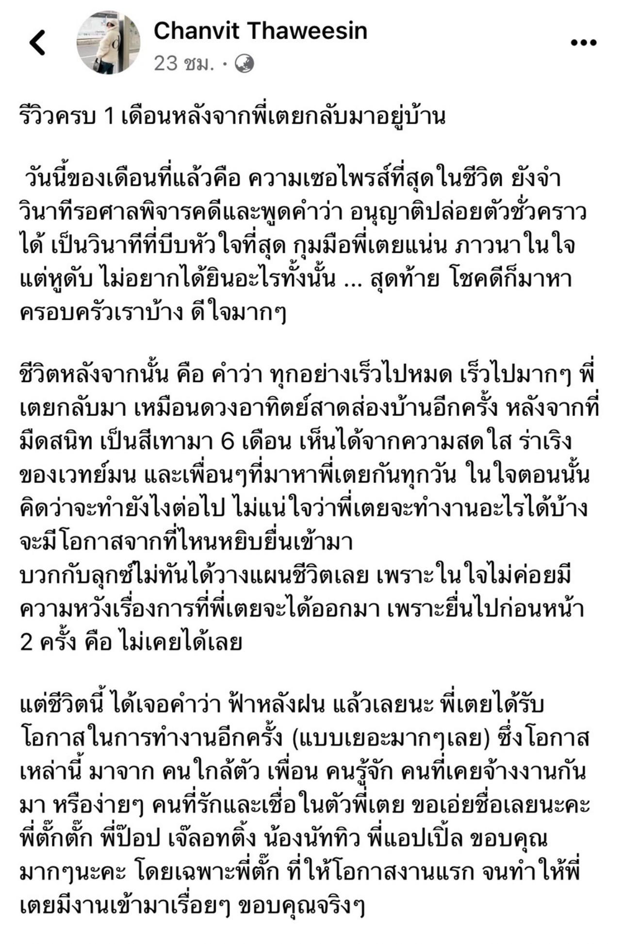 ชีวิตหลังจากนั้น คือ คำว่า ทุกอย่างเร็วไปหมด เร็วไปมากๆ พี่เตยกลับมา เหมือนดวงอาทิตย์สาดส่องบ้านอีกครั้ง หลังจากที่มืดสนิท เป็นสีเทามา 6 เดือน เห็นได้จากความสดใส ร่าเริง ของเวทย์มน และเพื่อนๆ ที่มาหาพี่เตยกันทุกวัน ในใจตอนนั้นคิดว่าจะทำอย่างไรต่อไป ไม่แน่ใจว่าพี่เตยจะทำงานอะไรได้บ้าง จะมีโอกาสจากที่ไหนหยิบยื่นเข้ามา บวกกับลุกซ์ไม่ทันได้วางแผนชีวิตเลย เพราะในใจไม่ค่อยมีความหวังเรื่องการที่พี่เตยจะได้ออกมา เพราะยื่นไปก่อนหน้า 2 ครั้ง คือไม่เคยได้เลย