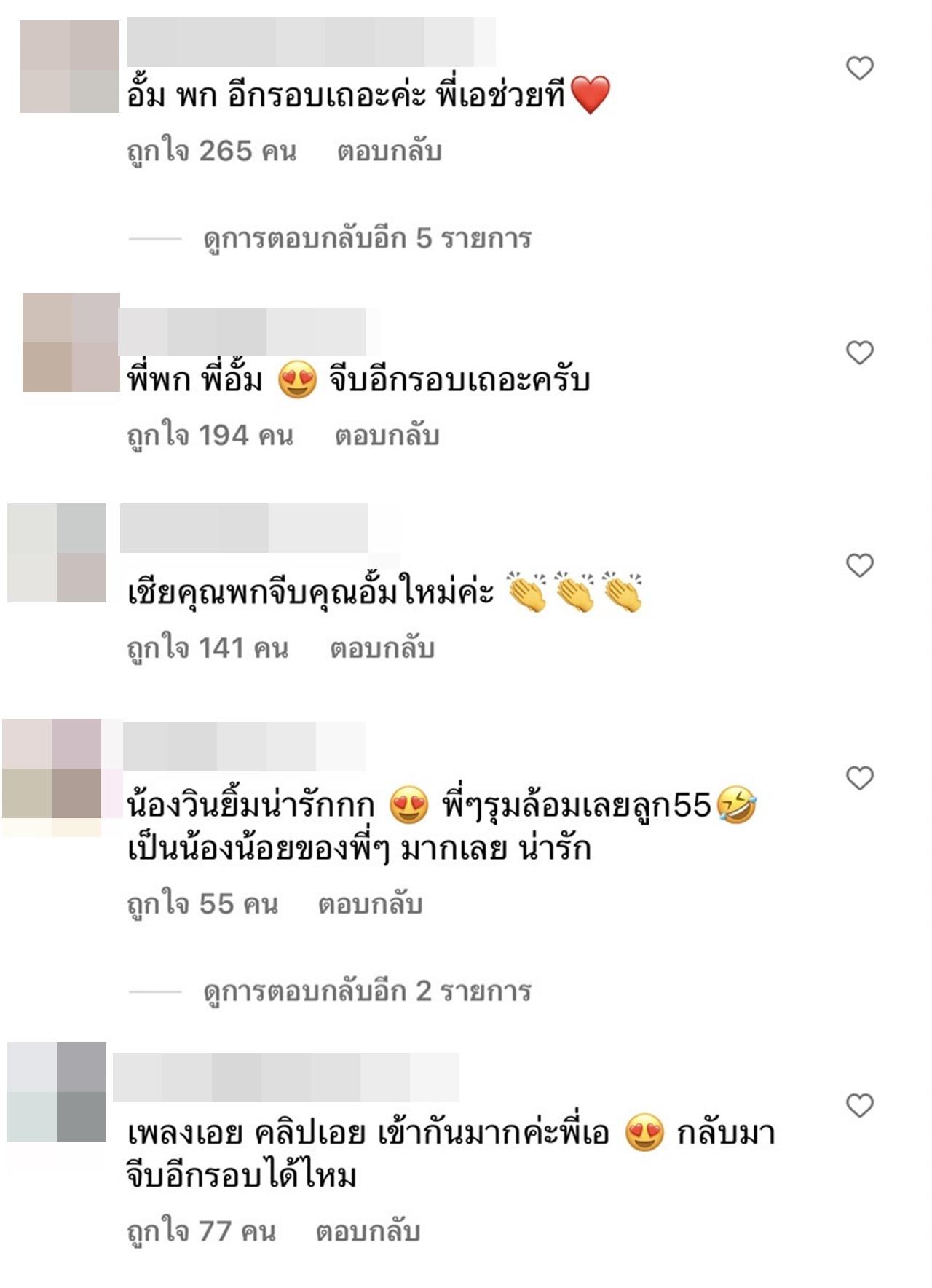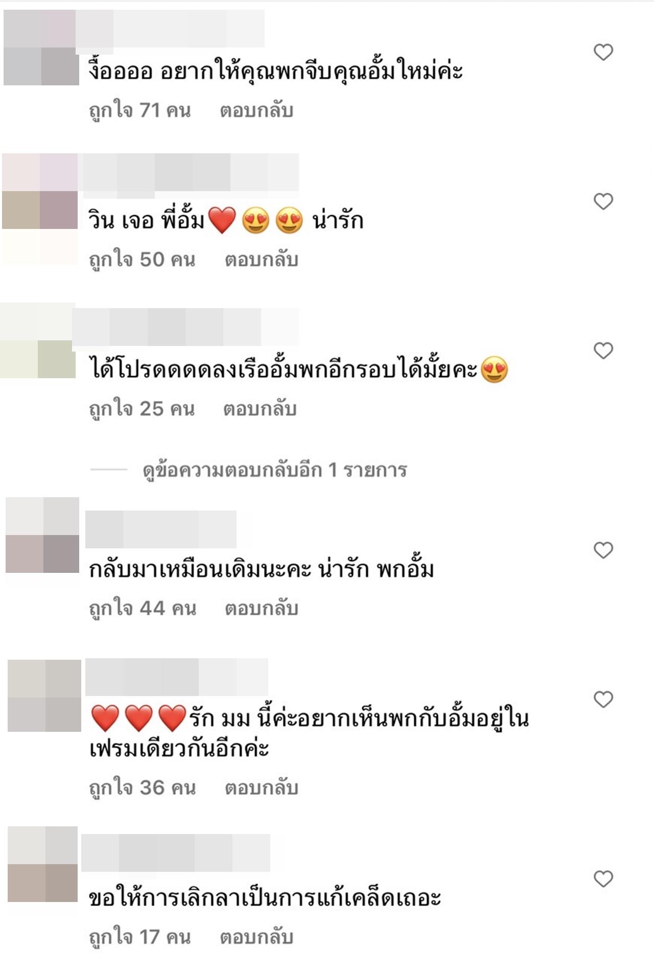 งานนี้ทำเอาแฟนๆ ต่างใจฟู เข้ามาคอมเมนต์เชียร์อยากให้ อั้ม กับ พก กลับมาจีบกันใหม่กันจำนวนมาก อาทิ อั้ม พก อีกรอบเถอะค่ะ พี่เอช่วยที, พี่พก พี่อั้ม จีบอีกรอบเถอะครับ, เชียร์คุณพกจีบคุณอั้มใหม่ค่ะ, เพลงเอย คลิปเอย เข้ากันมากค่ะพี่เอ กลับมาจีบอีกรอบได้ไหม, งื้ออออ อยากให้คุณพกจีบคุณอั้มใหม่ค่ะ, ได้โปรดดดดลงเรืออั้มพกอีกรอบได้มั้ยคะ, รัก มม นี้ค่ะอยากเห็นพกกับอั้มอยู่ในเฟรมเดียวกันอีกค่ะ, กลับมาเหมือนเดิมนะคะ น่ารัก พกอั้ม, ดูหลายรอบมากกกก อยากให้กลับมารักกันใหม่, ขอให้การเลิกราเป็นการแก้เคล็ดเถอะ เป็นต้น.