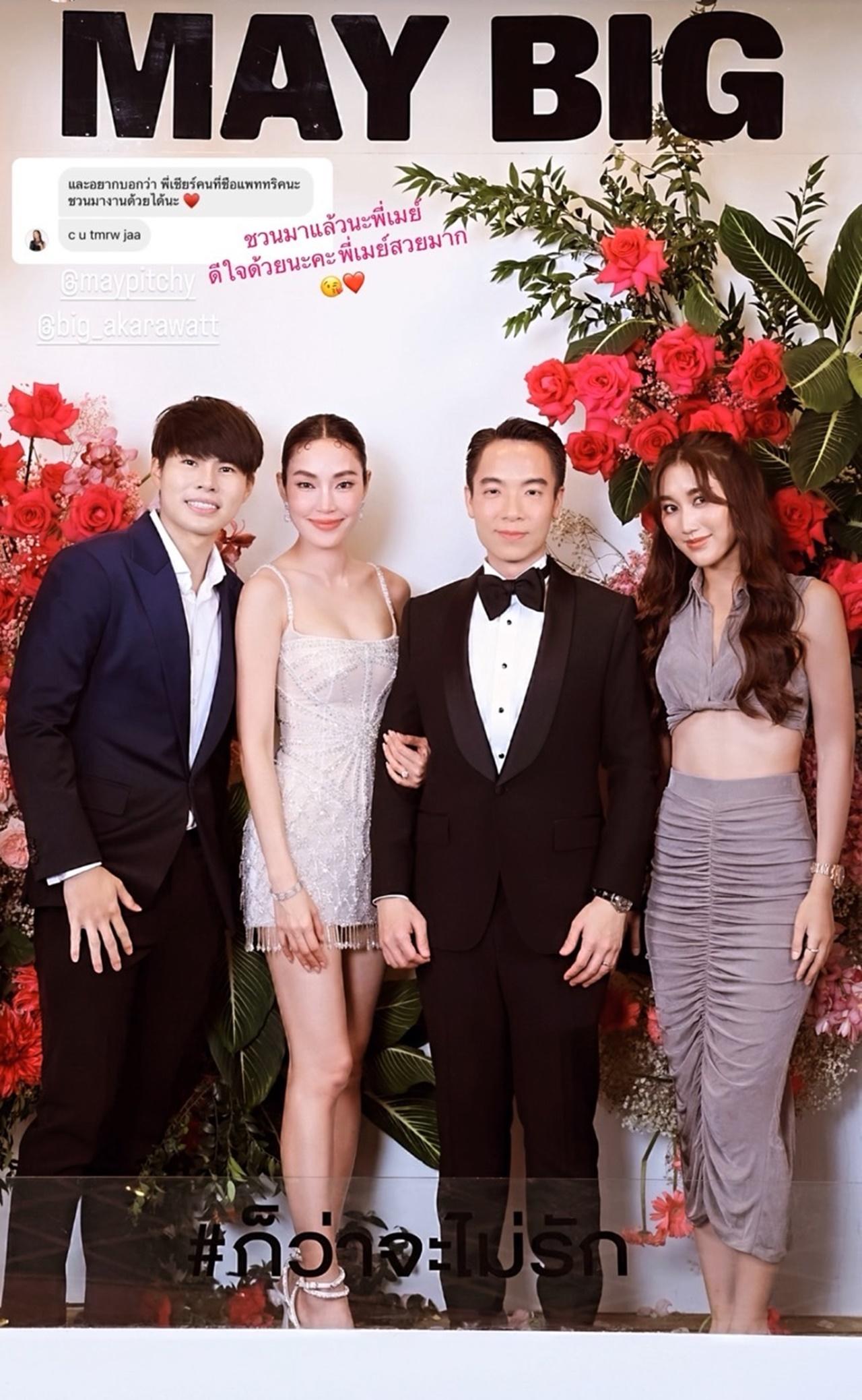 โดย เบสท์ ได้โพสต์ภาพผ่านไอจีสตอรี่ที่มาแสดงความยินดีกับบ่าวสาว พร้อมแนบแชตของ เมย์ พิชญ์นาฏ ที่ส่งมาบอกว่า "พี่เชียร์คนที่ชื่อแพทริคนะ ชวนมางานด้วยได้นะ" และ เบสท์ ได้เขียนตอบกลับว่า "ชวนมาแล้วนะคะพี่เมย์ ดีใจด้วยนะคะพี่เมย์ สวยมาก"