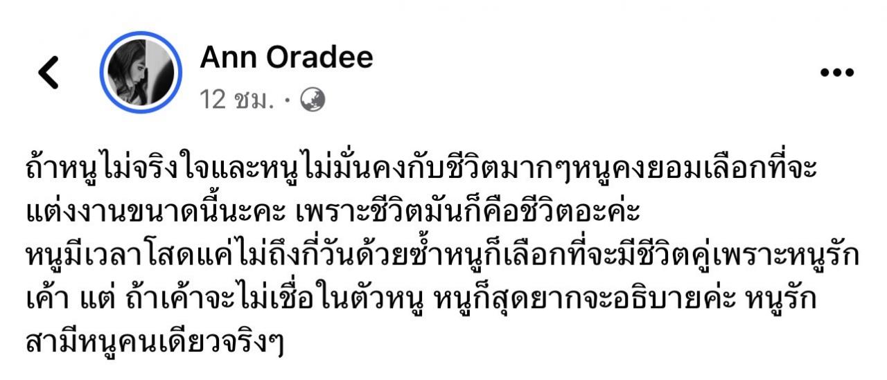 พร้อมบอกว่า "ไม่ต้องห่วงนะค้า ไม่มีคนเค้าให้ห่วงค่า", "อย่ากด ห่วงใย หนูนะ" ต่อมาโพสต์อีกข้อความบอกว่า "ถ้าหนูไม่จริงใจและหนูไม่มั่นคงกับชีวิตมากๆหนูคงยอมเลือกที่จะแต่งงานขนาดนี้นะคะ เพราะชีวิตมันก็คือชีวิตอะค่ะหนูมีเวลาโสดแค่ไม่ถึงกี่วันด้วยซ้ำหนูก็เลือกที่จะมีชีวิตคู่เพราะหนูรักเค้า แต่ ถ้าเค้าจะไม่เชื่อในตัวหนู หนูก็สุดยากจะอธิบายค่ะ หนูรักสามีหนูคนเดียวจริงๆ"