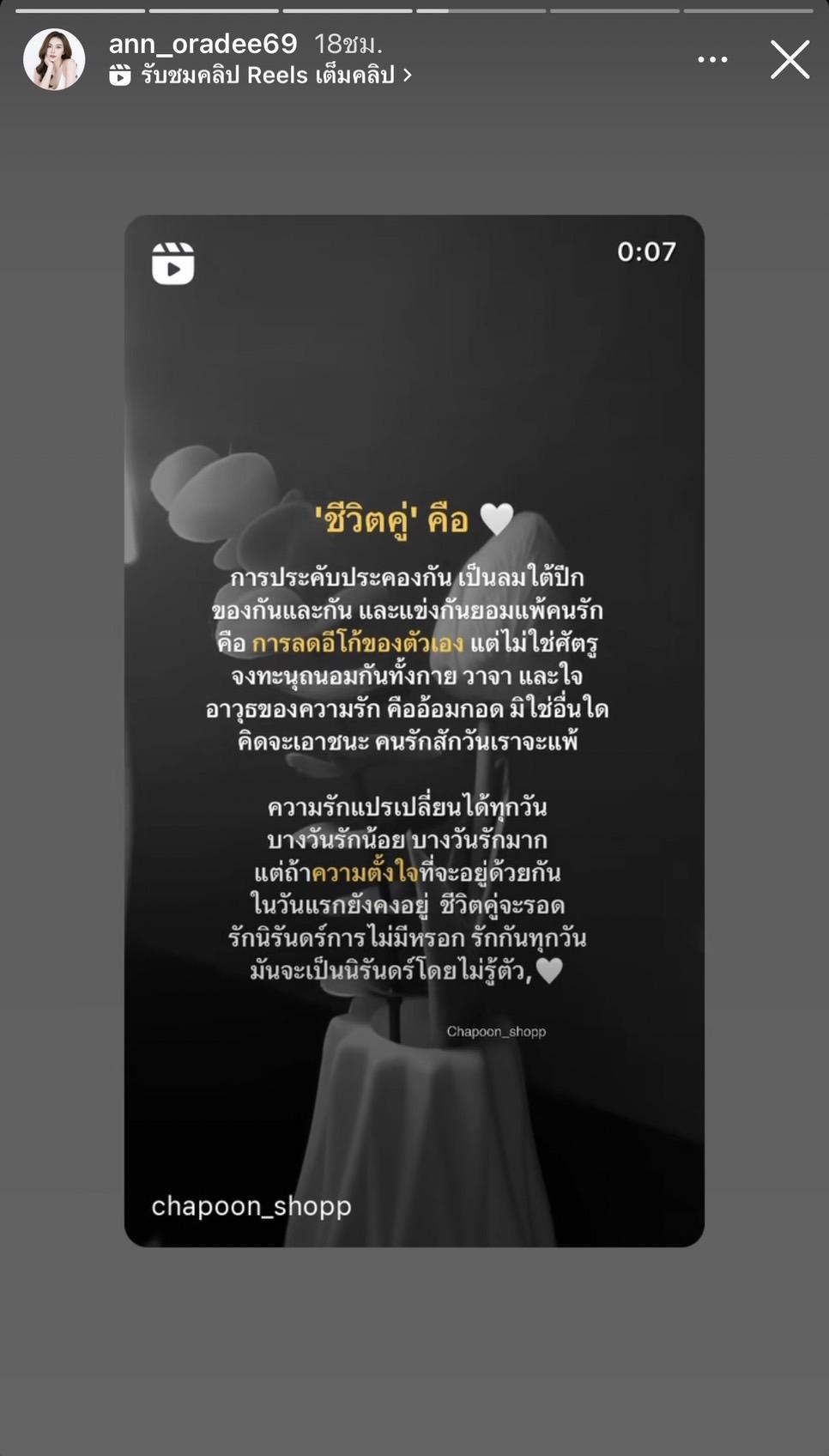 นอกจากนี้ ในสตอรี่ก็ได้แชร์ข้อความต่างๆ ทั้งบอกว่า "ชีวิตคู่ คือ การประคับประคองกัน เป็นลมใต้ปีก ของกันและกัน และแข่งกันยอมแพ้คนรัก คือ การลดอีโก้ของตัวเอง แต่ไม่ใช่ศัตรู จงทะนุถนอมกันทั้งกาย วาจา และใจ อาวุธของความรัก คืออ้อมกอด มิใช่อื่นใด คิดจะเอาชนะ คนรักสักวันเราจะแพ้ ความรักแปรเปลี่ยนได้ทุกวัน บางวันรักน้อย บางวันรักมาก แต่ถ้าความตั้งใจที่จะอยู่ด้วยกันในวันแรกยังคงอยู่ ชีวิตคู่จะรอด รักนิรันดร์การไม่มีหรอก รักกันทุกวัน มันจะเป็นนิรันดร์โดยไม่รู้ตัว"