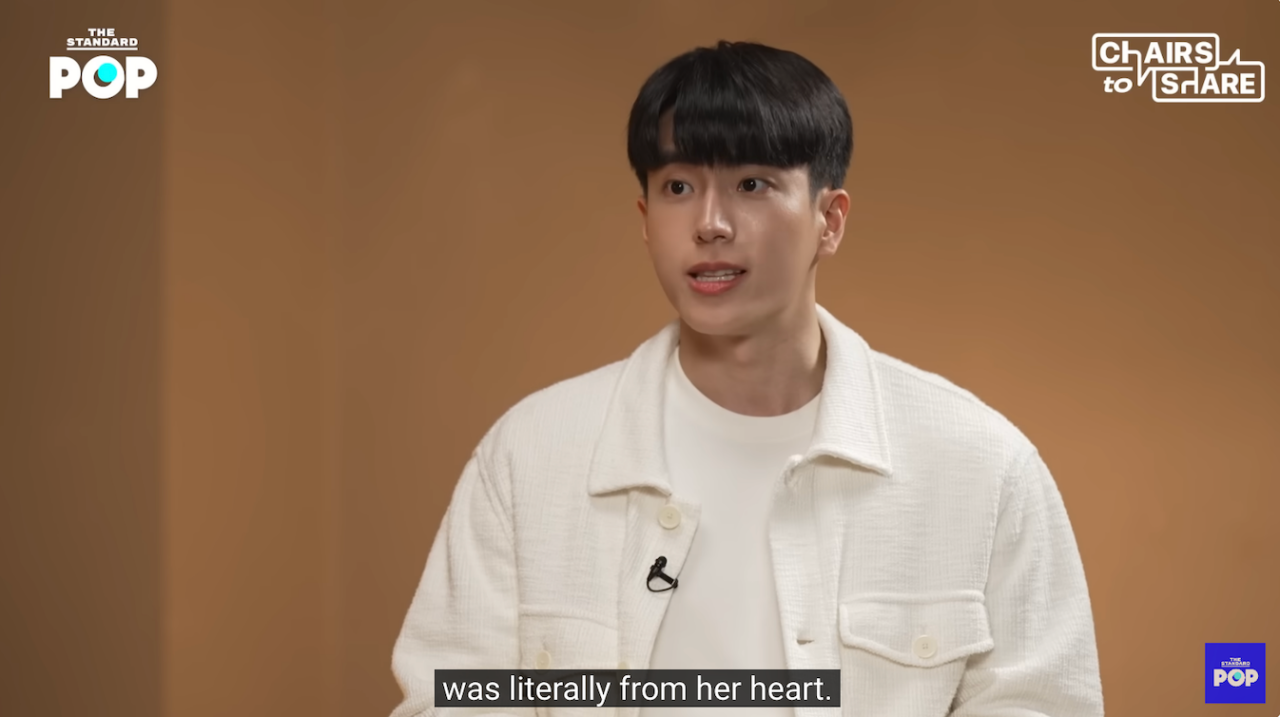 ไม่ได้มองว่าเป็นเรื่องใหญ่อะไรเลย ผมโอเค ผมแฮปปี้กับสิ่งที่ผมมีอยู่ตรงนี้ ถ้าพี่ไม่สบายใจ มองมาที่ผม แล้วผมจะกล้าพูดว่าไม่เป็นไร พี่ไม่สบายใจแต่ผมสบายใจมากๆ นะ ผมพร้อมจะเป็นแรงซัพพอร์ตตรงนั้นเพื่อสร้างความสบายใจให้พี่มากขึ้นเรื่อยๆ