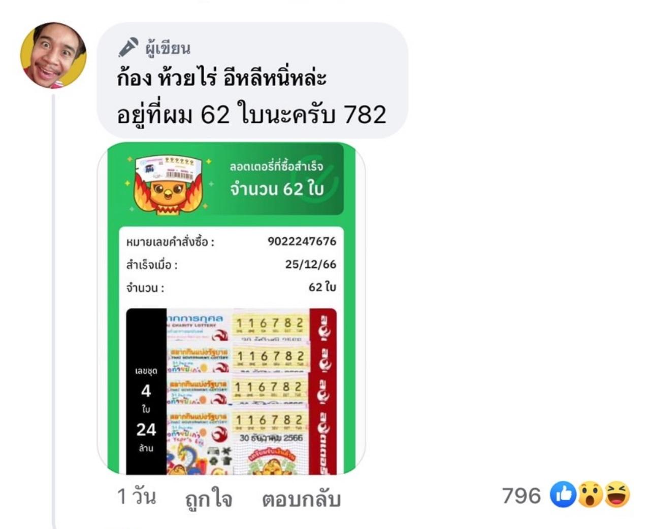 นอกจากนี้ ก้อง ยังได้โชว์บ้านเลขที่แบบชัดๆ อีกด้วย พร้อมกับบอกว่า เลข 782 เหมาไปหมดแผงแล้ว "อยู่ที่ผม 62 ใบนะครับ 782".