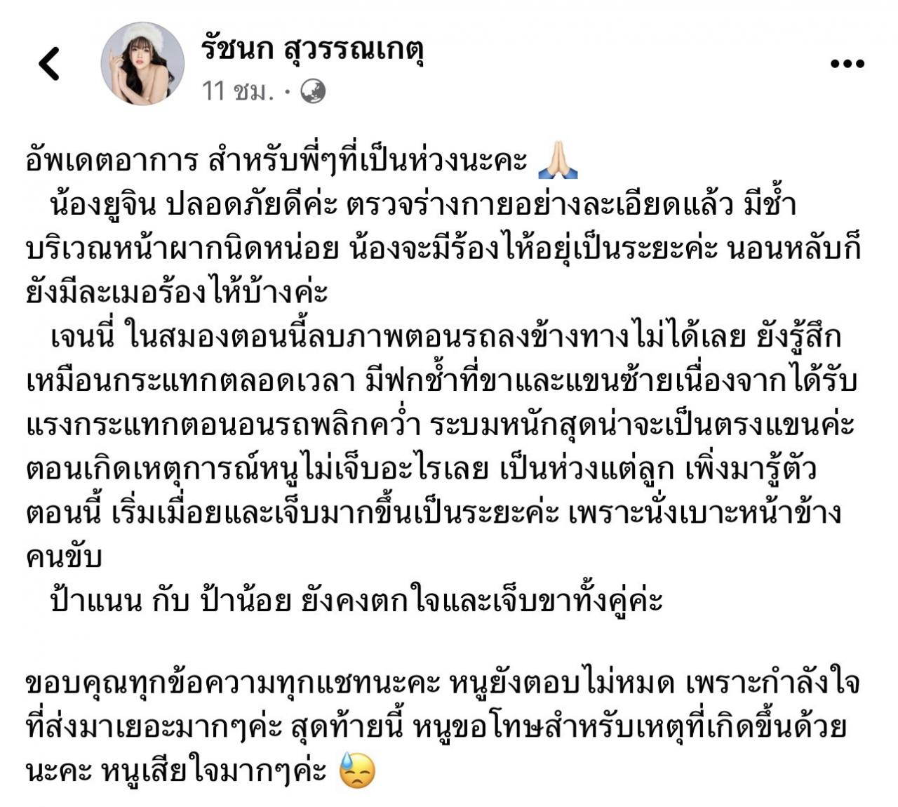พร้อมกับเคลื่อนไหวทางเฟซบุ๊กส่วนตัวว่า "อัปเดตอาการ สำหรับพี่ๆ ที่เป็นห่วงนะคะ น้องยูจิน ปลอดภัยดีค่ะ ตรวจร่างกายอย่างละเอียดแล้ว มีช้ำบริเวณหน้าผากนิดหน่อย น้องจะมีร้องไห้อยู่เป็นระยะค่ะ นอนหลับก็ยังมีละเมอร้องไห้บ้างค่ะ