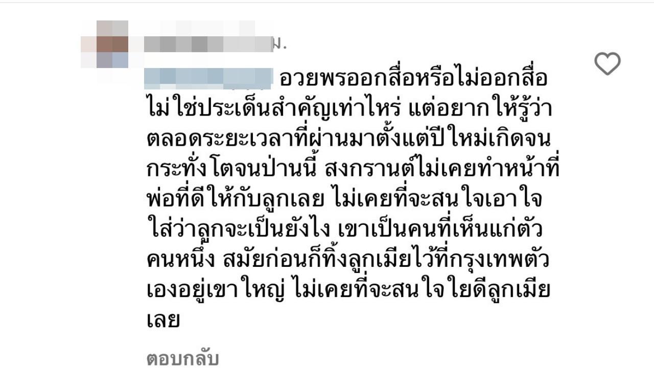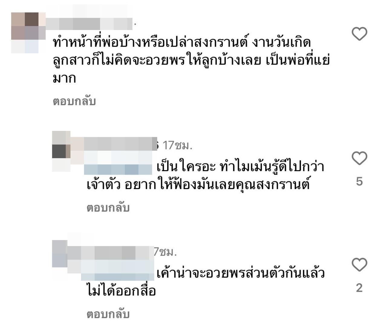 และชาวเน็ตคนดังกล่าวก็เข้ามาคอมเมนต์ต่อว่าด้วยถ้อยคำที่รุนแรงว่า "ทำหน้าที่พ่อบ้างหรือเปล่าสงกรานต์ งานวันเกิดลูกสาวก็ไม่คิดจะอวยพรให้ลูกบ้างเลย เป็นพ่อที่แย่มาก"