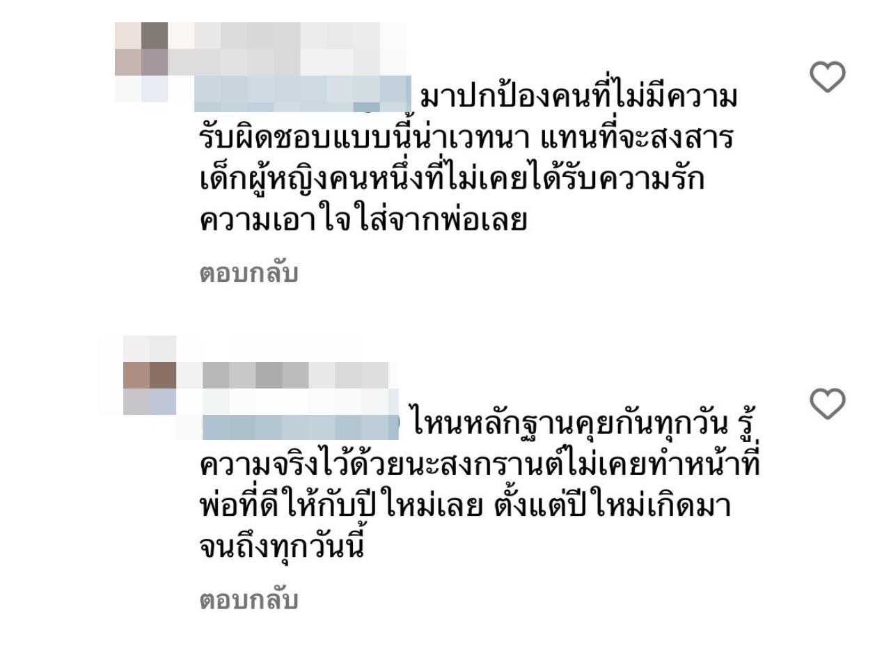 แต่ชาวเน็ตคนดังกล่าวก็ยังไม่หยุด ได้คอมเมนต์ตอบโต้คนที่เข้ามาเตือนว่า "มาปกป้องคนที่ไม่มีความรับผิดชอบแบบนี้น่าเวทนา แทนที่จะสงสารเด็กผู้หญิงคนหนึ่งที่ไม่เคยได้รับความรักความเอาใจใส่จากพ่อเลย, ไหนหลักฐานคุยกันทุกวัน รู้ความจริงไว้ด้วยนะ สงกรานต์ไม่เคยทำหน้าที่พ่อที่ดีให้กับปีใหม่เลย ตั้งแต่ปีใหม่เกิดมาจนถึงทุกวันนี้,
