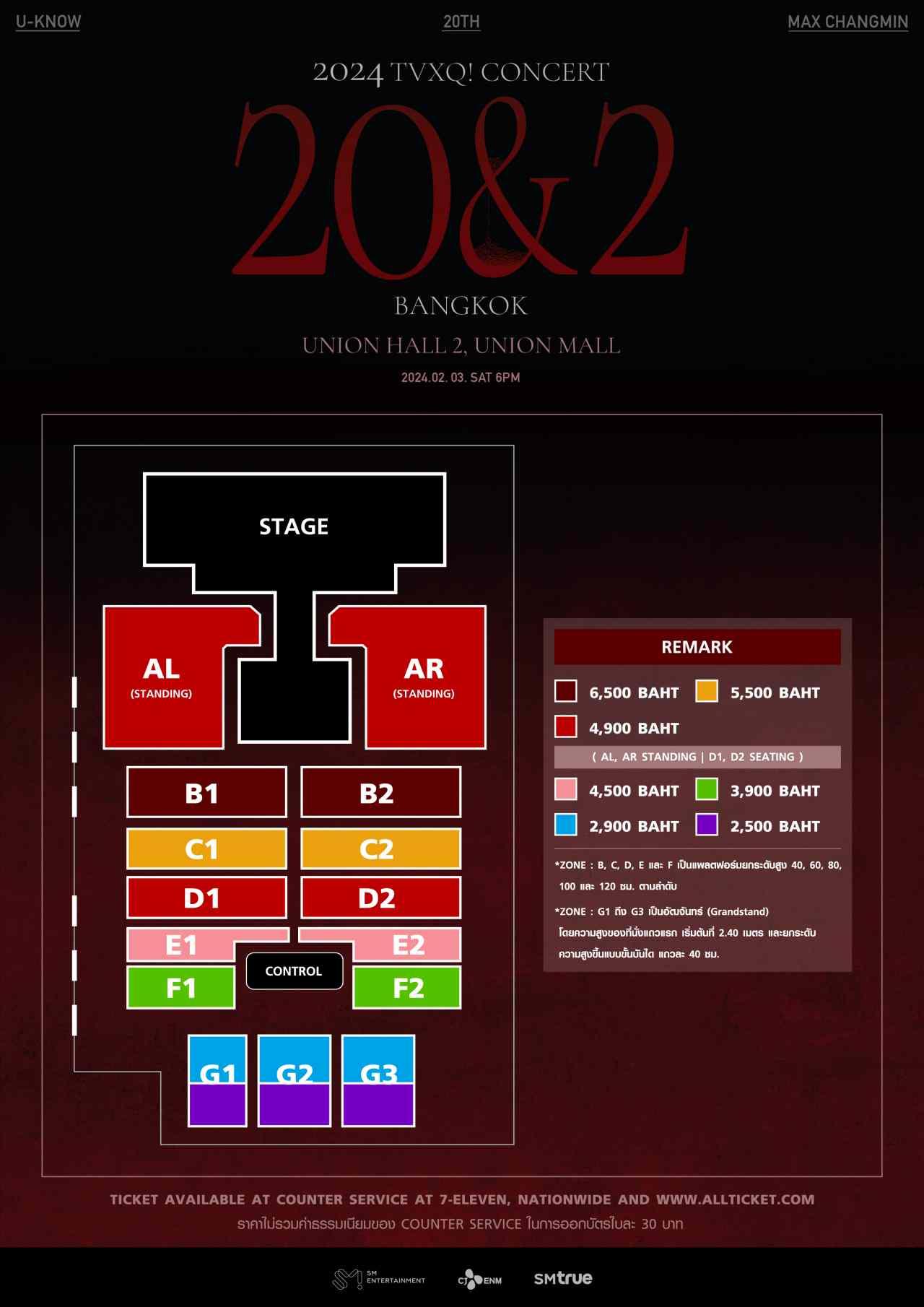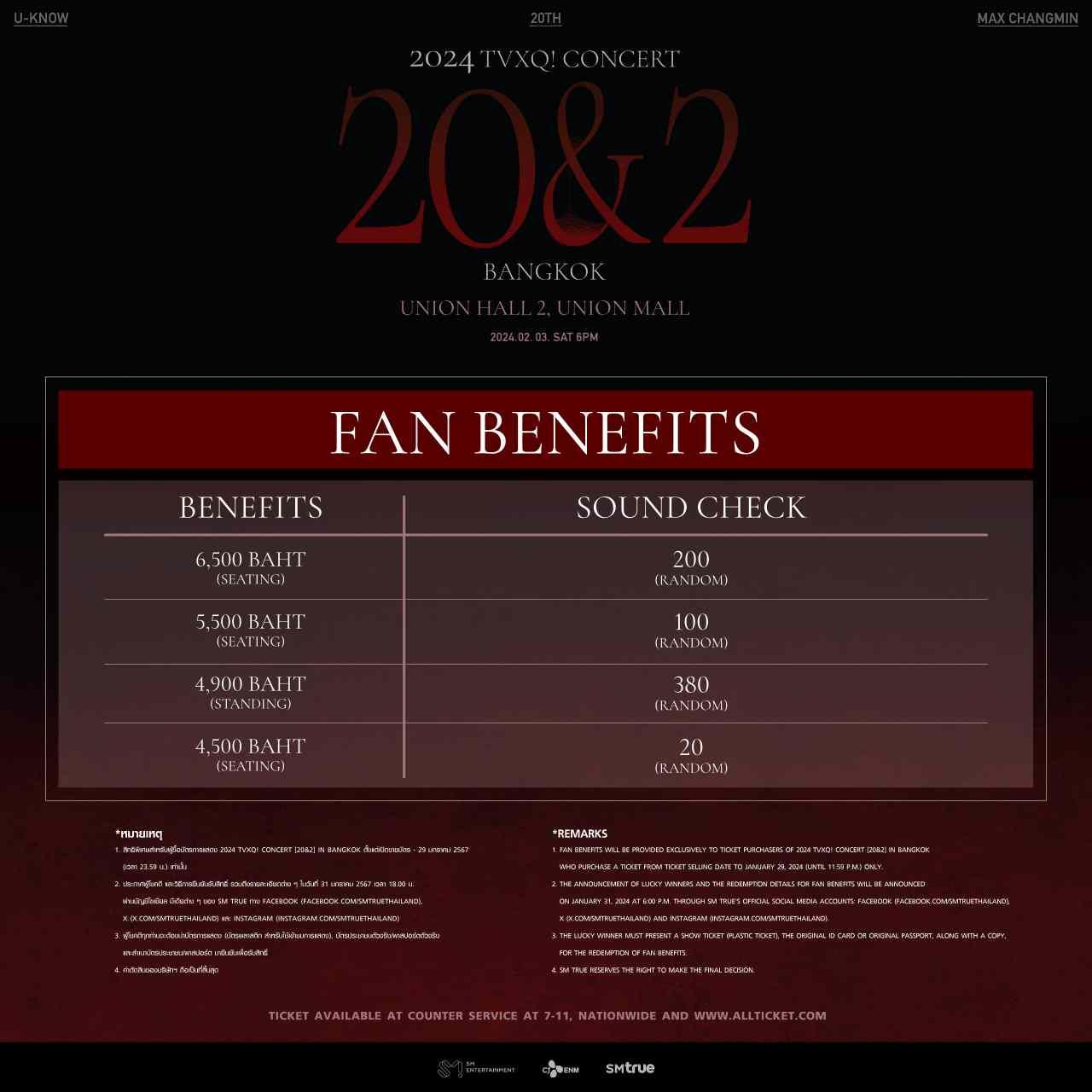 Cassiopeia (แคสสิโอเปีย: ชื่อแฟนคลับอย่างเป็นทางการ) เตรียมมาแสดงพลังแห่งทะเลสีแดงที่ยังคงร้อนแรงและสวยงามไม่เปลี่ยนแปลงมาตลอด 20 ปีไปด้วยกัน ในคอนเสิร์ตที่ทุกคนรอคอย ‘2024 TVXQ! CONCERT [20&2] IN BANGKOK’ เปิดจำหน่ายบัตรรอบ Cassiopeia Membership (GL) Pre-Sale (Weverse) ในวันพฤหัสบดีที่ 11 มกราคม 2567 เวลา 19.00 - 23.00 น. เท่านั้น และรอบบุคคลทั่วไป ในวันศุกร์ที่ 12 มกราคม 2567 ตั้งแต่เวลา 19.00 น. เป็นต้นไป ทางเคาน์เตอร์เซอร์วิสในร้าน 7-Eleven ทุกสาขาทั่วประเทศ และทางเว็บไซต์ www.allticket.com/event/2024_TVXQ_20&2_INBKK ราคา 6,500 / 5,500 / 4,900 / 4,500 / 3,900 / 2,900 / 2,500 บาท พร้อมสิทธิพิเศษสำหรับผู้ซื้อบัตร