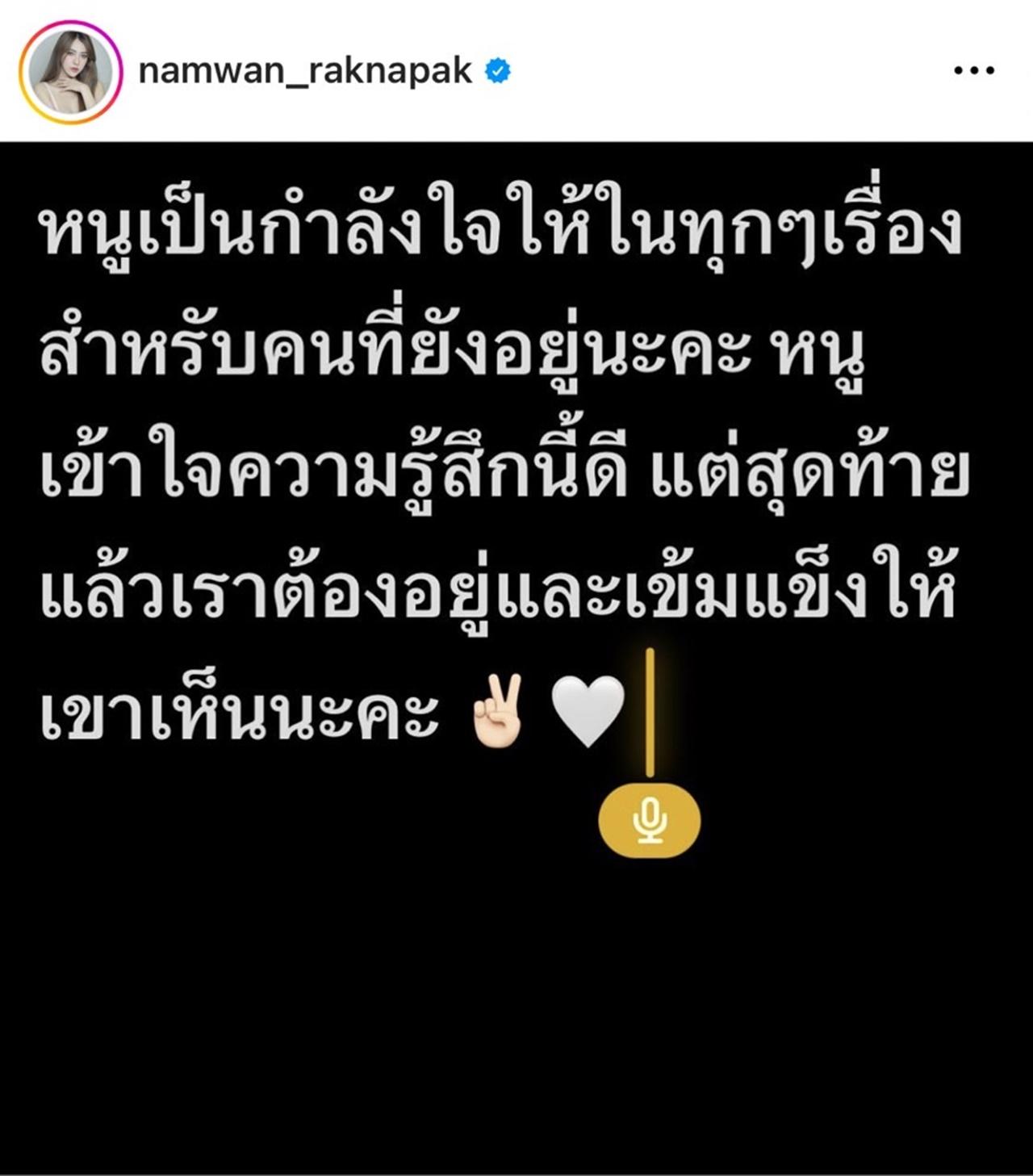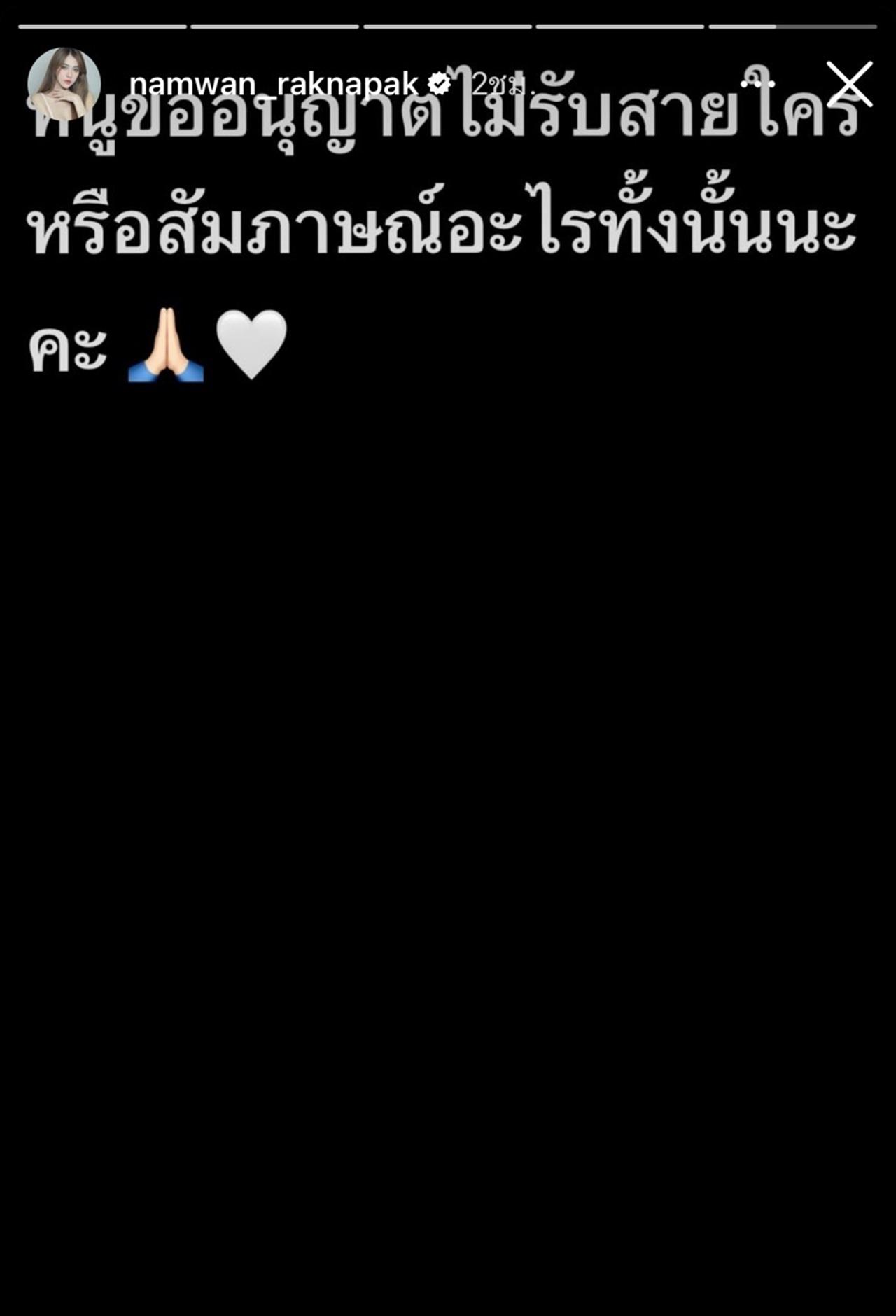 จากนั้นเจ้าตัวก็ได้โพสต์ข้อความผ่านไอจีสตอรี่ว่า "หนูขออนุญาตไม่รับสายใคร หรือสัมภาษณ์อะไรทั้งนั้นนะคะ" และได้โพสต์ข้อความเพิ่มเติมว่า "หนูเป็นกำลังใจให้ในทุกๆ เรื่อง สำหรับคนที่ยังอยู่นะคะ หนูเข้าใจความรู้สึกนี้ดี แต่สุดท้ายแล้วเราต้องอยู่และเข้มแข็งให้เขาเห็นนะคะ" หลายคนที่ติดตามได้เข้ามาส่งกำลังใจให้ น้ำหวาน จำนวนมาก พร้อมกับต่างสงสัยว่าเกิดอะไรขึ้น.