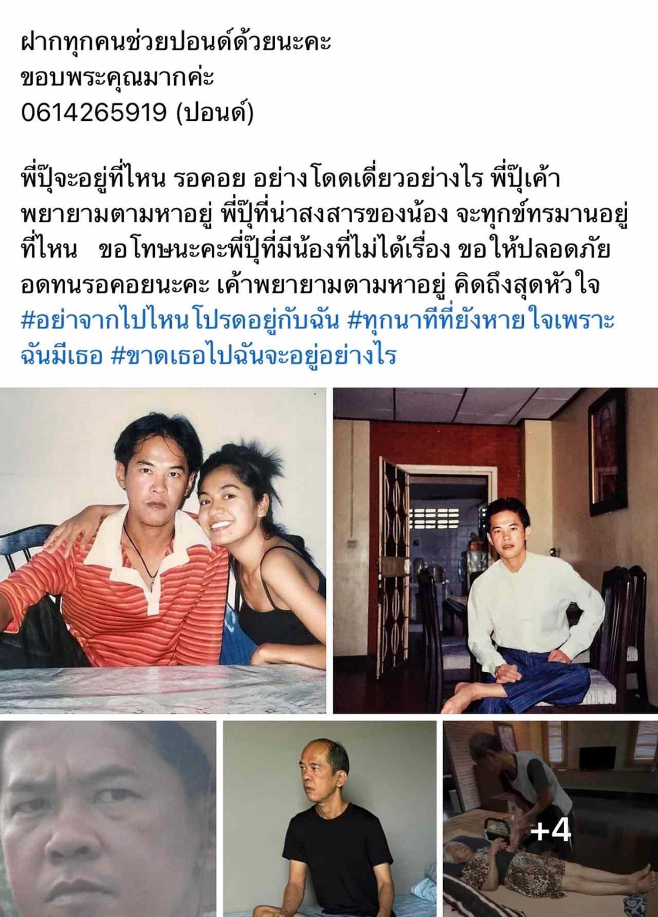 พี่ปุ๊เป็นผู้ป่วยจิตเวชที่ได้รับการรักษาต่อเนื่องมาหลายปี จะมีพฤติกรรมสงบ เงียบ เรียบร้อย เหมือนคนปกติทั่วไป แต่อาการที่ผิดปกติคือ พี่ปุ๊มักจะมีคนกระซิบให้เข้าเฝ้า จึงหนีออกจากบ้าน พี่ปุ๊ไม่มีตังค์ติดตัว ไม่มีมือถือ ไม่ได้พกพากระเป๋าอะไรติดตัวไป ฝากทุกคนช่วยปอนด์ด้วยนะคะ ขอบพระคุณมากค่ะ 0614265919 (ปอนด์)