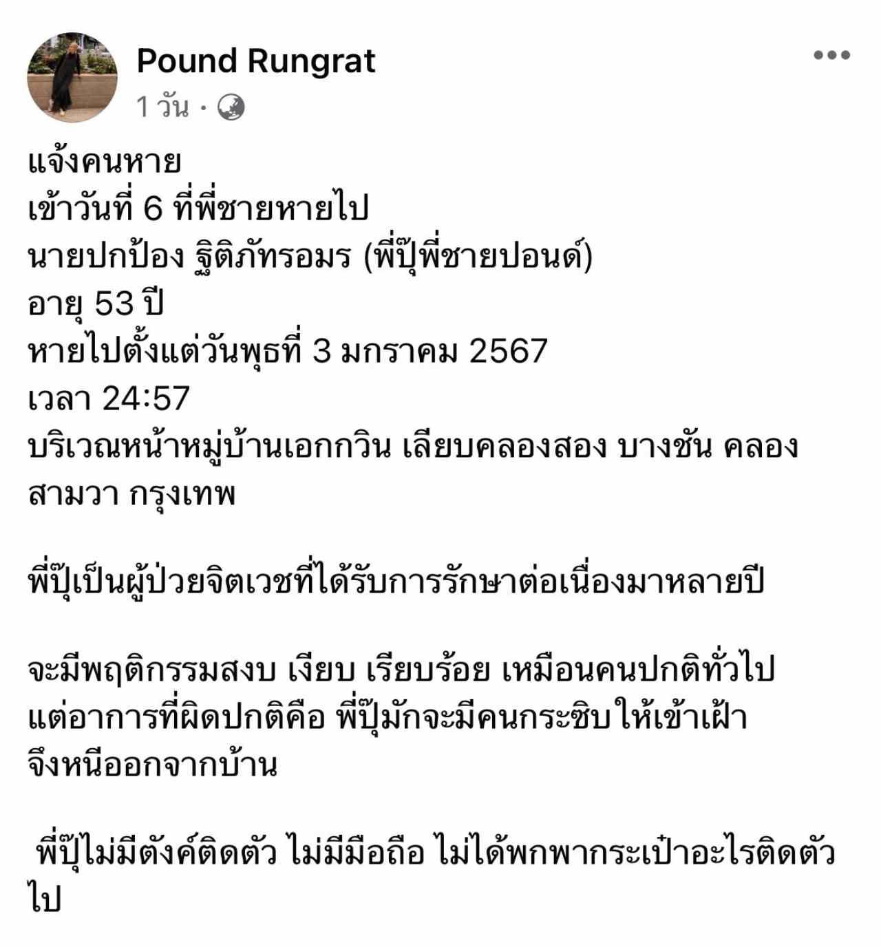 "แจ้งคนหาย เข้าวันที่ 6 ที่พี่ชายหายไป นายปกป้อง ฐิติภัทรอมร (พี่ปุ๊พี่ชายปอนด์) อายุ 53 ปี หายไปตั้งแต่วันพุธที่ 3 มกราคม 2567