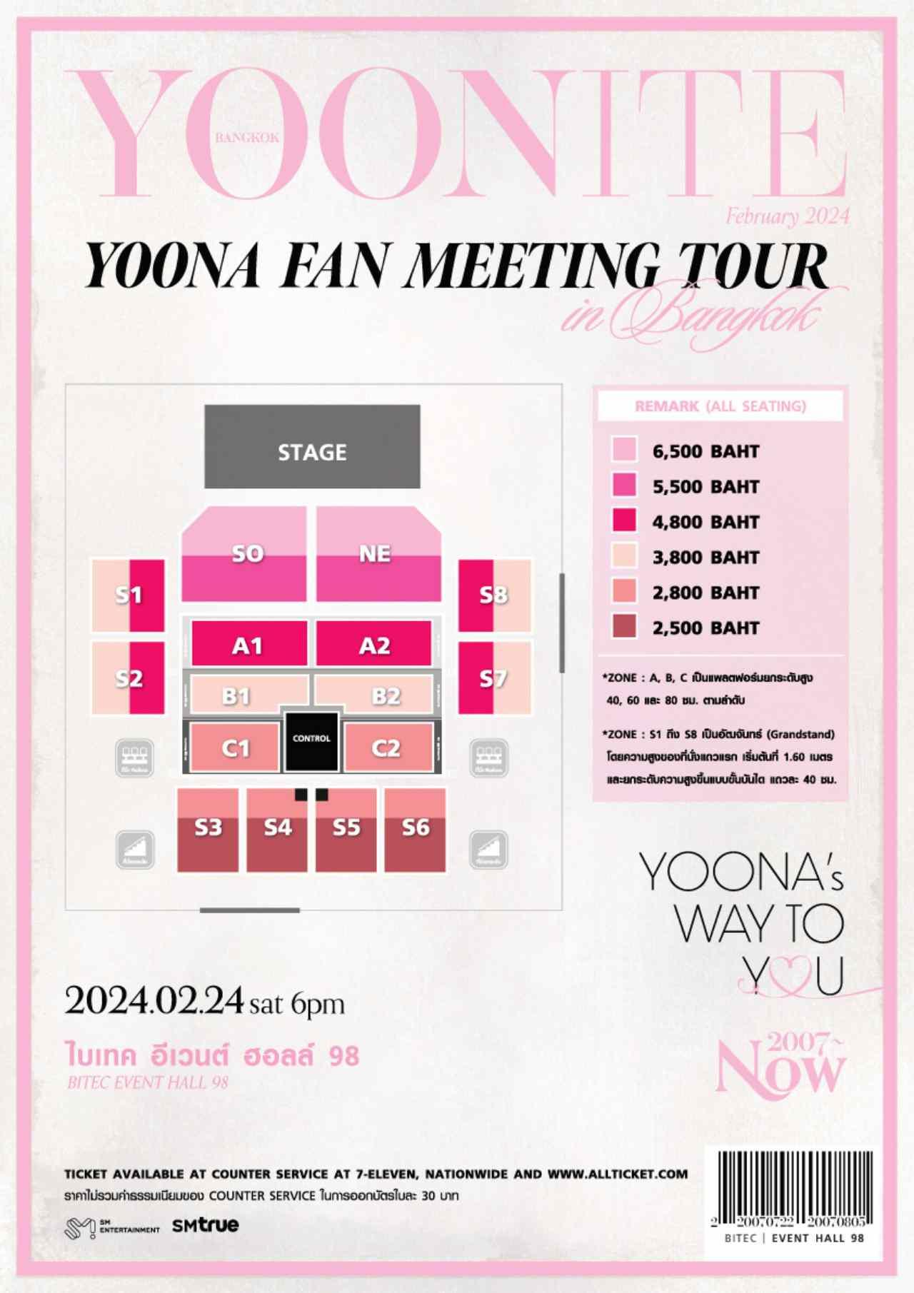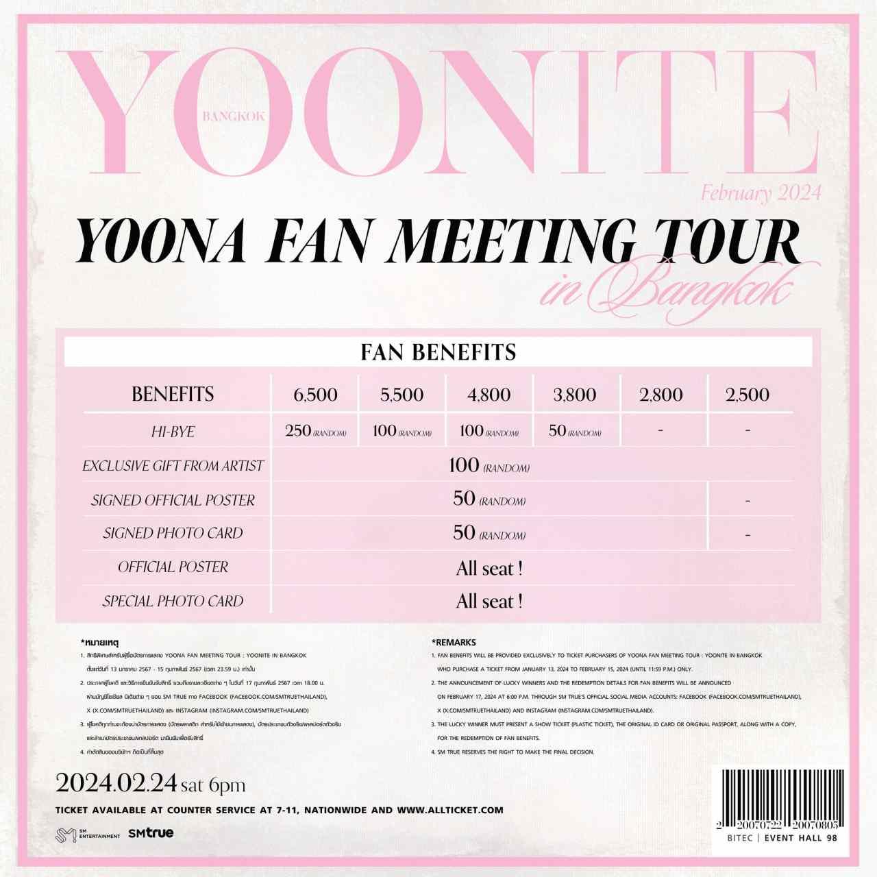 และค่ำคืนนั้น ‘YOONA’ กับ ‘S♡NE’ (โซวอน: ชื่อแฟนคลับอย่างเป็นทางการ) จะรวมใจกันเป็นหนึ่งเดียว ในงานแฟนมีตติ้งเดี่ยวที่ประเทศไทยในรอบ 5 ปี 7 เดือน ที่ทุกคนต่างตั้งตารอคอย YOONA FAN MEETING TOUR : YOONITE in BANGKOK เปิดจำหน่ายบัตรรอบ S♡NE Membership (GL) Pre-Sale (Weverse) ในวันเสาร์ที่ 13 มกราคม 2567 เวลา 11.00 น. - 13.00 น. เท่านั้น และรอบบุคคลทั่วไป ในวันอาทิตย์ที่ 14 มกราคม 2567 ตั้งแต่เวลา 11.00 น. เป็นต้นไป ทางเคาน์เตอร์เซอร์วิสในร้าน 7-Eleven ทุกสาขาทั่วประเทศ และทางเว็บไซต์ www.allticket.com/event/YOONITEinBKK ราคาบัตรนั่งทั้งหมด 6,500 / 5,500 / 4,800 / 3,800 / 2,800 / 2,500 บาท พร้อมสิทธิพิเศษสำหรับผู้ซื้อบัตร ติดตามข่าวสารและรายละเอียดเพิ่มเติมของแฟนมีตติ้งได้ทางบัญชีโซเชียลมีเดียต่างๆ ของ SM True : เฟซบุ๊ก facebook.com/smtruethailand, อินสตาแกรม instagram.com/smtruethailand และเอ็กซ์ x.com/SMTrueThailand สอบถามข้อมูลเพิ่มเติมเกี่ยวกับการซื้อบัตรแฟนมีตติ้งได้ที่ Counter Service Call Center 02-826-7788